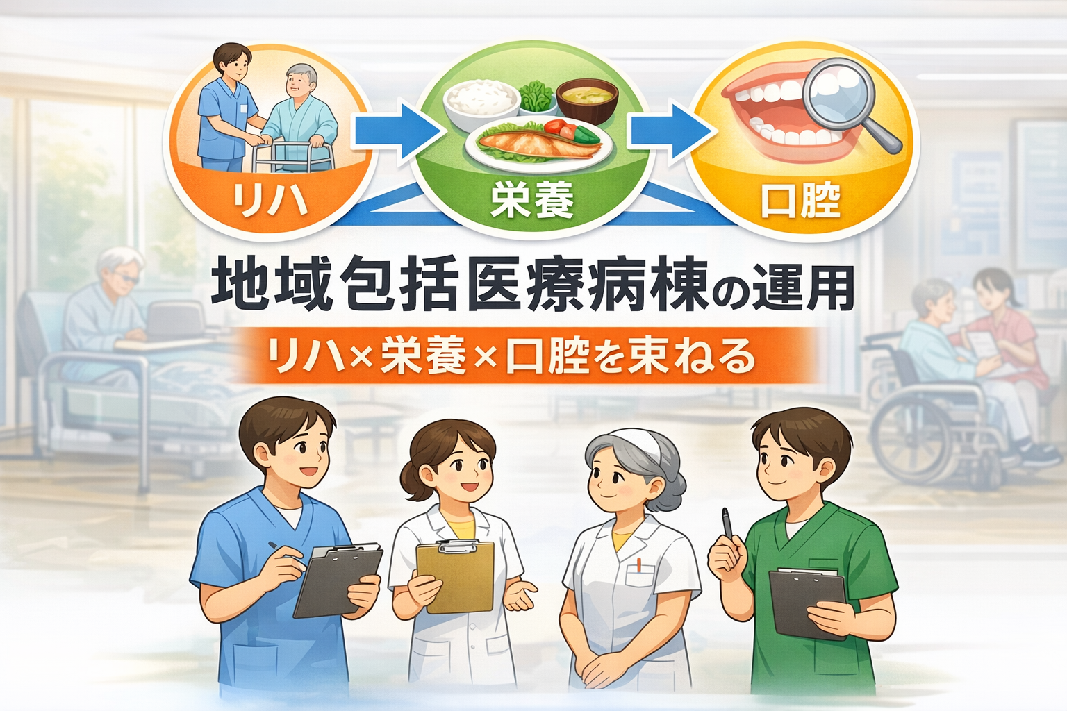 地域包括医療病棟は、救急〜急性期の一部を担いながら、退院支援・在宅復帰までを病棟単位でつなぐ役割を持ちます。現場で大事なのは、点数や区分よりも、入棟直後から生活機能の方向性( ADL ・栄養・口腔 )を同じ地図で見て、退院前まで “同じ言葉” で引き継げることです。