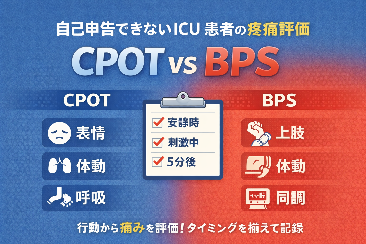 CPOT と BPS は「自己申告できない ICU 患者の疼痛」を行動から評価するスケールです