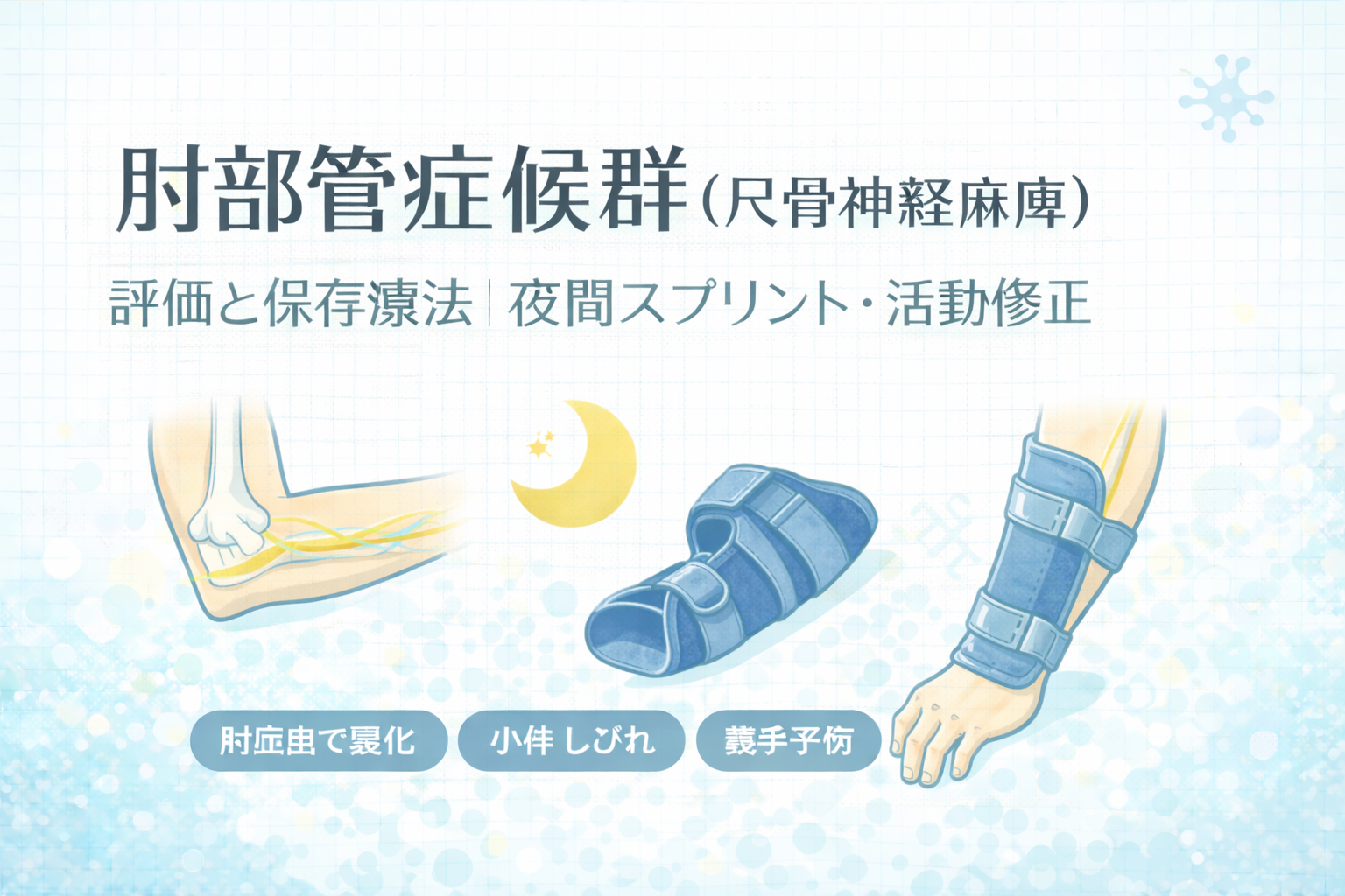 最初は活動修正です。肘屈曲の連続時間と肘当て(局所圧)を減らすだけで、夜間・日中の症状が変わることがあります。次に夜間スプリントを検討します。