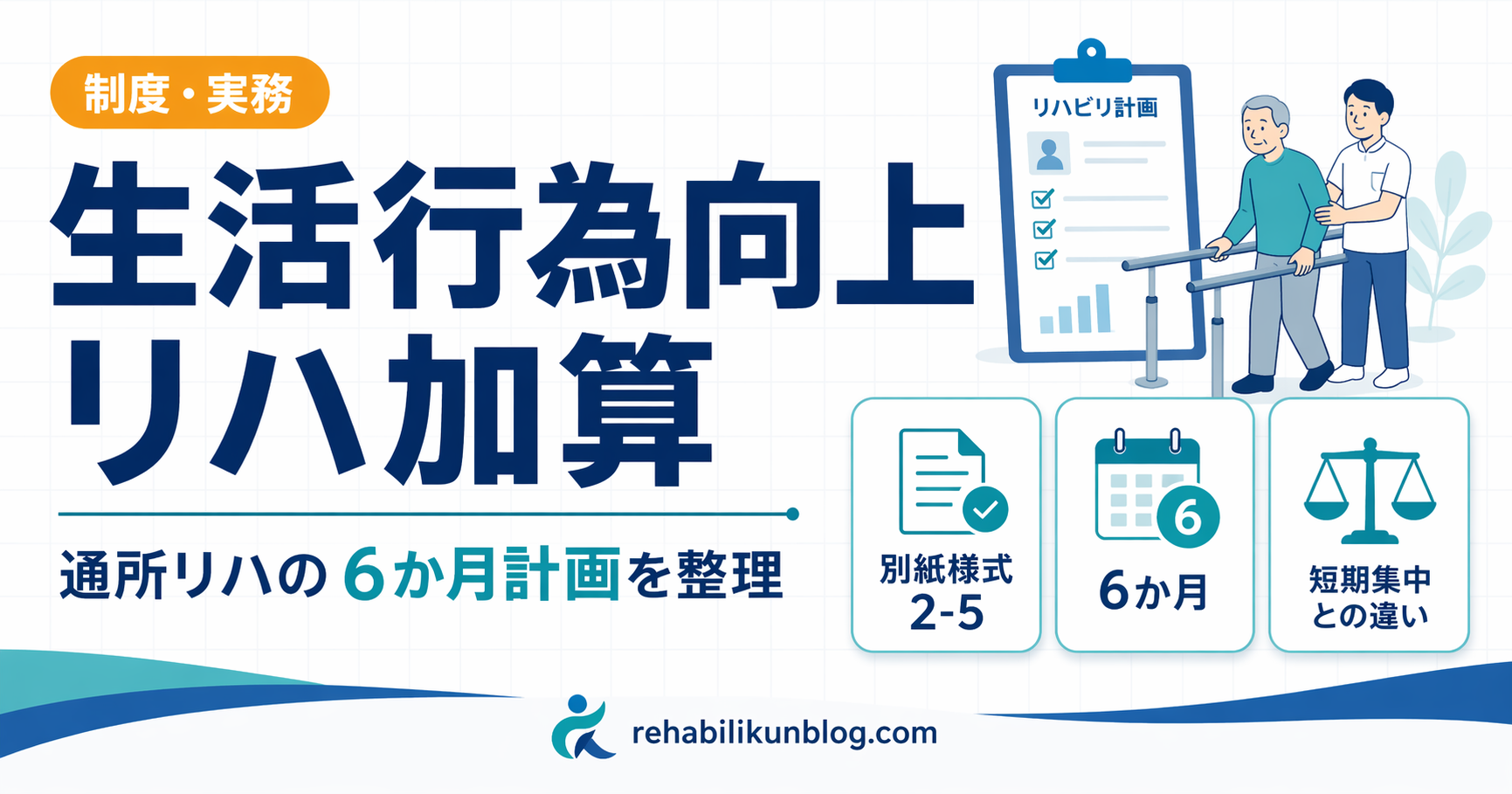 ポイントは、生活行為の選び方、別紙様式 2-5 の見方、6 か月計画、短期集中個別リハとの違いです。短期集中個別リハの 3 か月設計は 通所リハの短期集中個別リハ加算|対象・起算日・終了 で整理し、本記事では生活行為向上リハに絞って解説します。