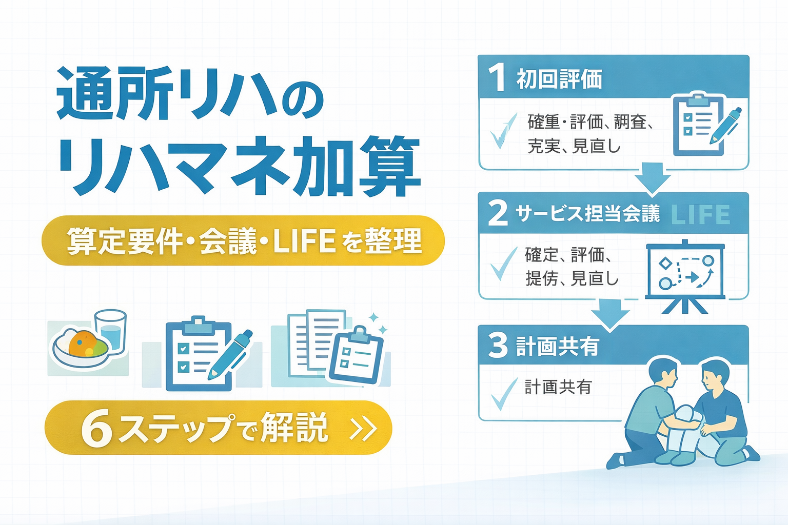 通所リハのリハマネ加算は、区分だけ覚えても現場では回りません。まずは「評価→会議→計画→見直し」の型を固定し、そのうえで LIFE、口腔、栄養の情報をどう戻すかを整えると、運用が安定します。