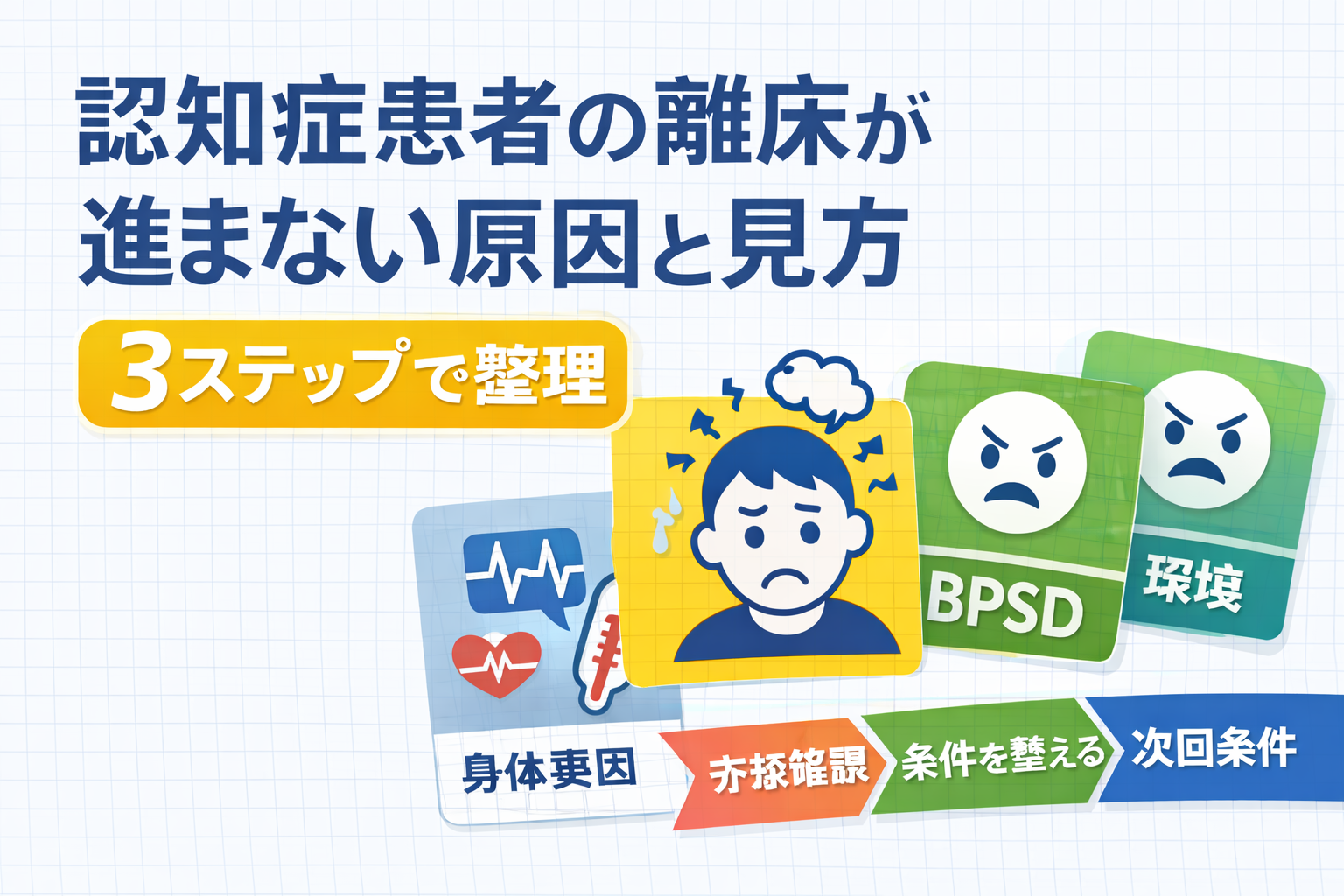 この記事では、認知症患者の離床停滞をどう見立て、どこまで進め、何を記録に残すかを実務ベースで整理します。なお、 BPSD の全体像や観察・尺度の基本から確認したい場合は、 BPSD 評価の進め方を先に押さえておくと、今回の内容がつながりやすくなります。