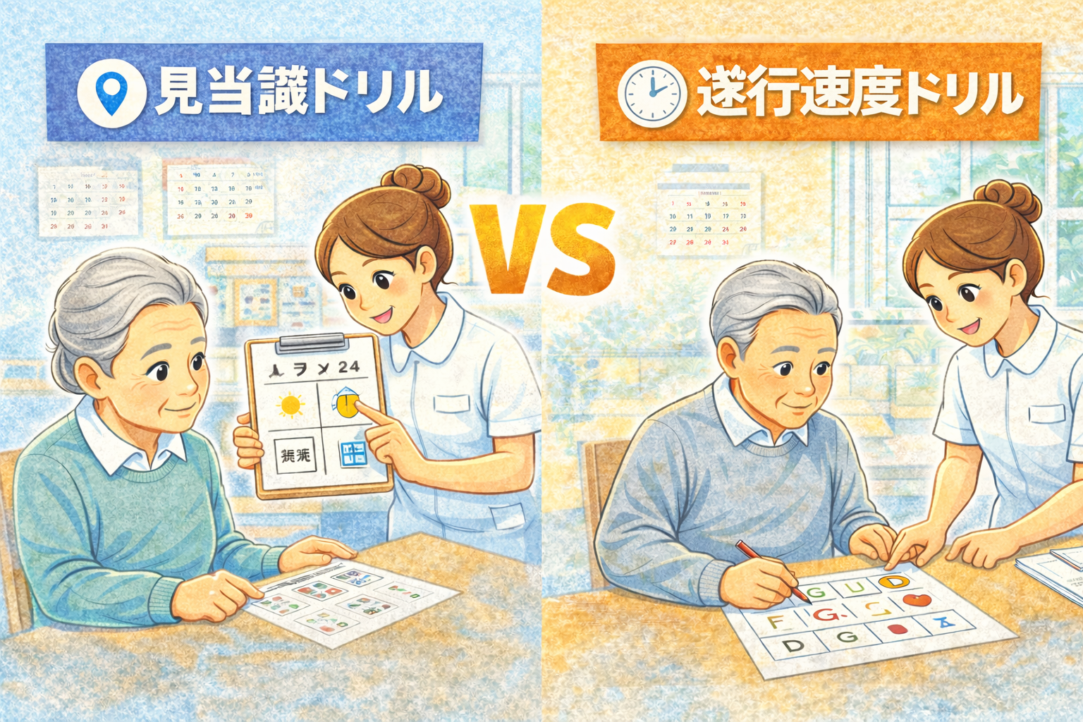 見当識ドリルは「どこで・いつ・何をするか」をそろえる課題、遂行速度ドリルは「正確さを保ってどのくらい速く処理できるか」を追う課題です。両者を同じ目的で扱うと、介入判断が曖昧になります。