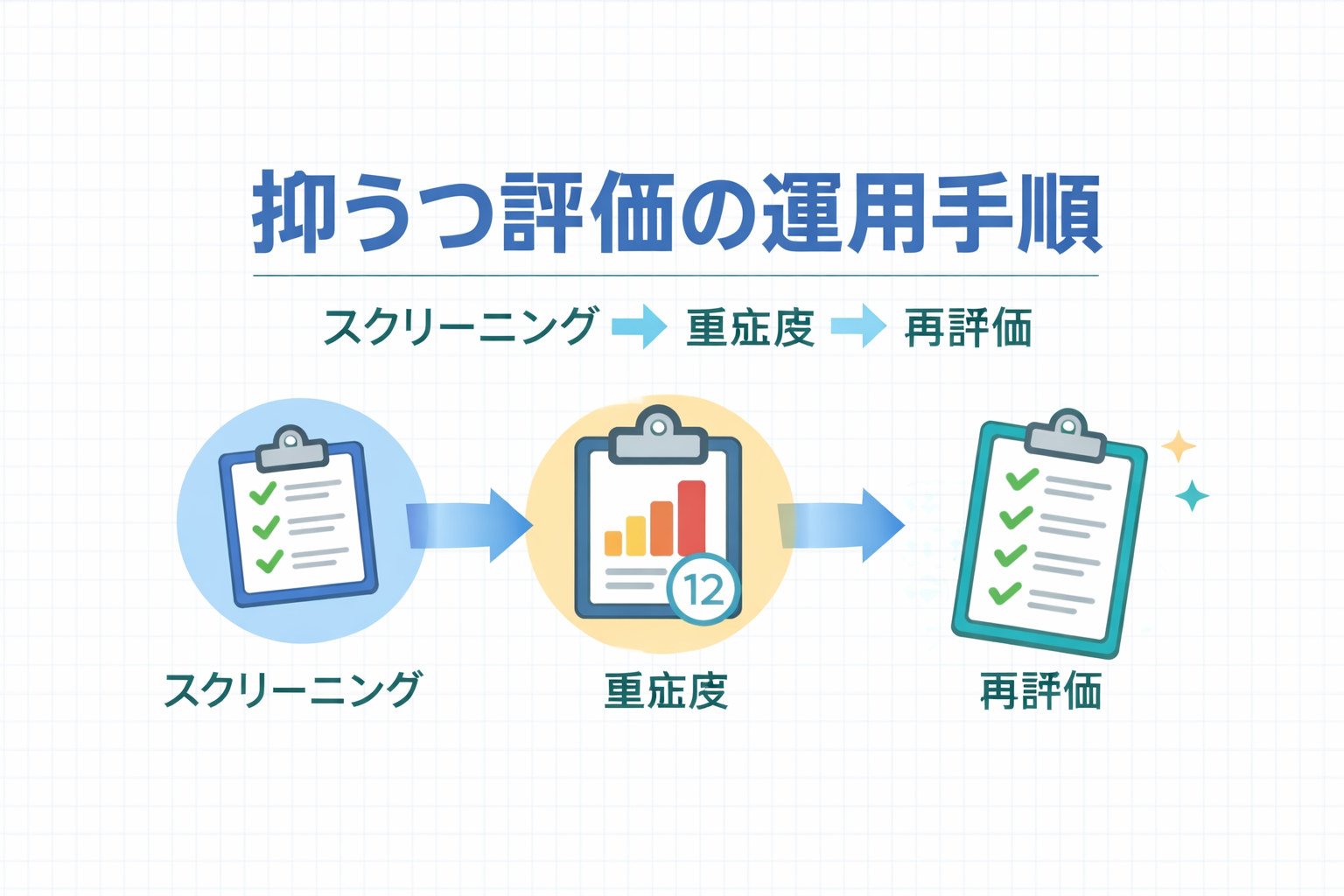 抑うつ評価の流れ(スクリーニング→重症度→再評価を現場で回す)