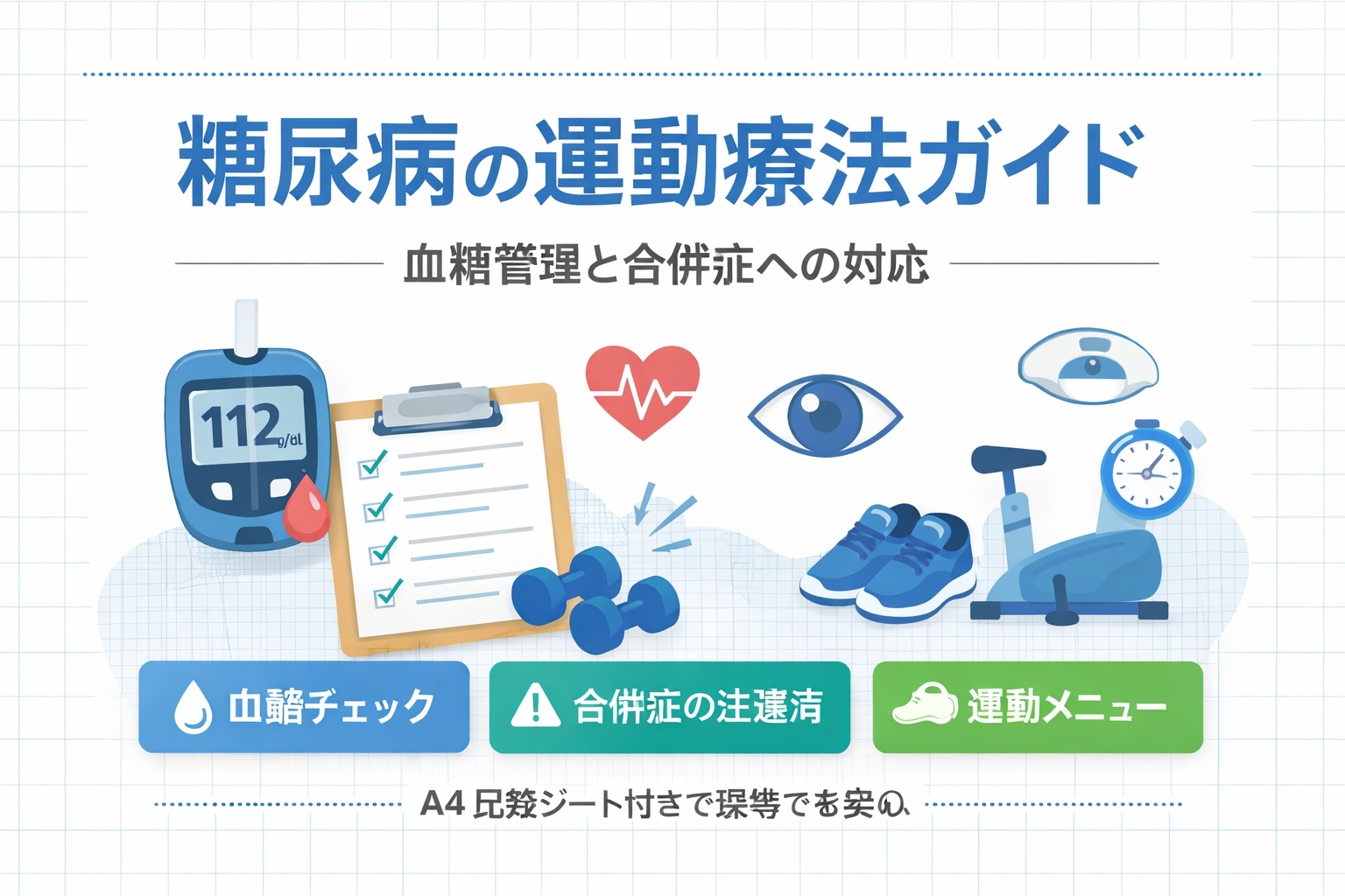糖尿病の運動療法は「何をどれだけやるか」だけでは不十分です。リハ現場で安全に回すには、①運動前の血糖とその日の条件(食事・薬・体調)を揃える、②合併症(網膜症・腎症・神経障害・足病変)で“避けたい負荷”を把握する、③次回に活きる形で記録して共有する、の 3 点が核になります。