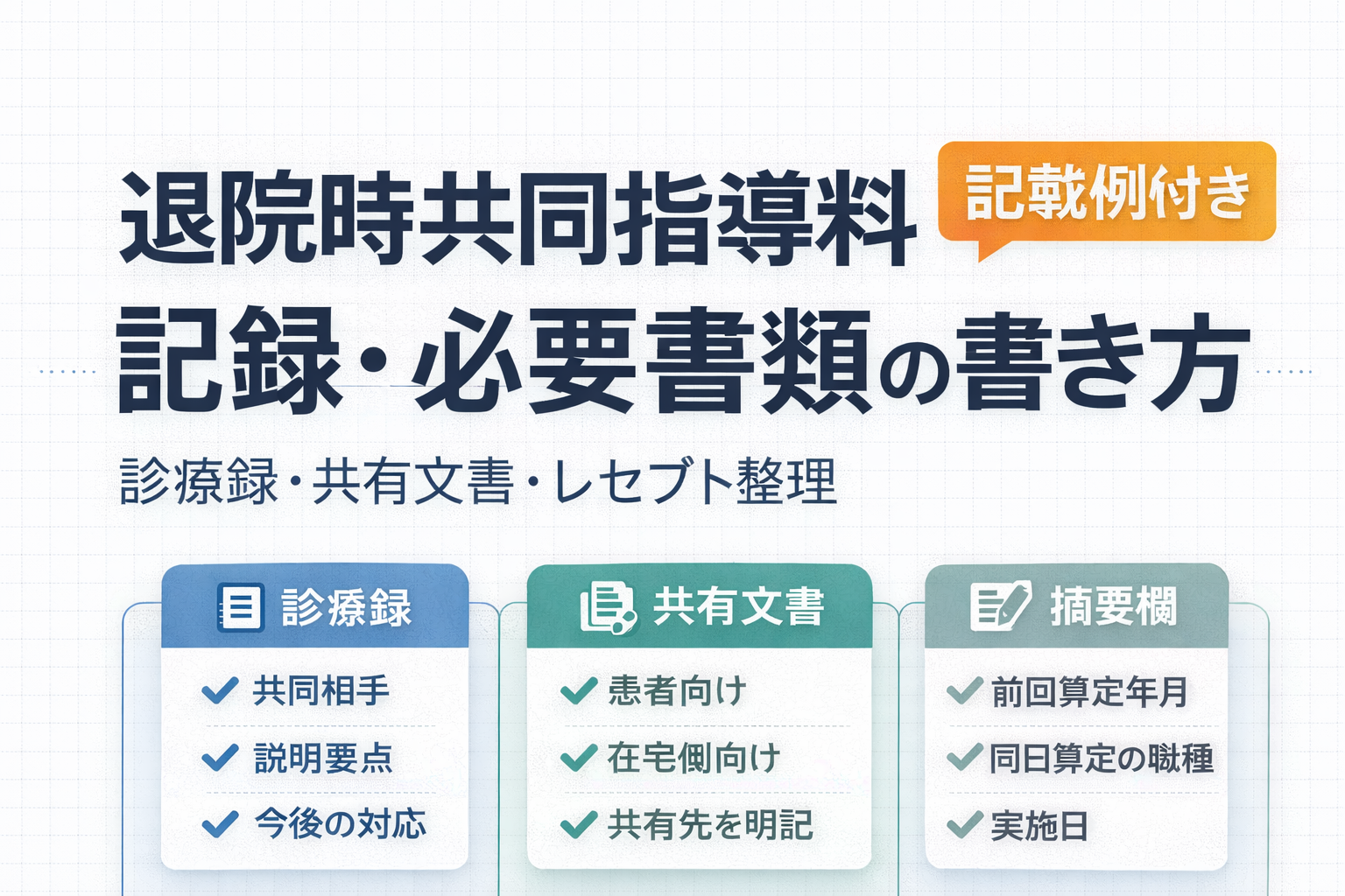 退院時共同指導料 2 で止まりやすいのは、「共同で説明した」まではできても、何を診療録に残すかどの文書を在宅側へ共有するかレセプトで何を記載するかが院内でそろっていないことです。実際の現場では、説明の質そのものよりも、誰が何を説明し、何を渡し、どこに残したかが曖昧なままだと運用が不安定になりやすいです。