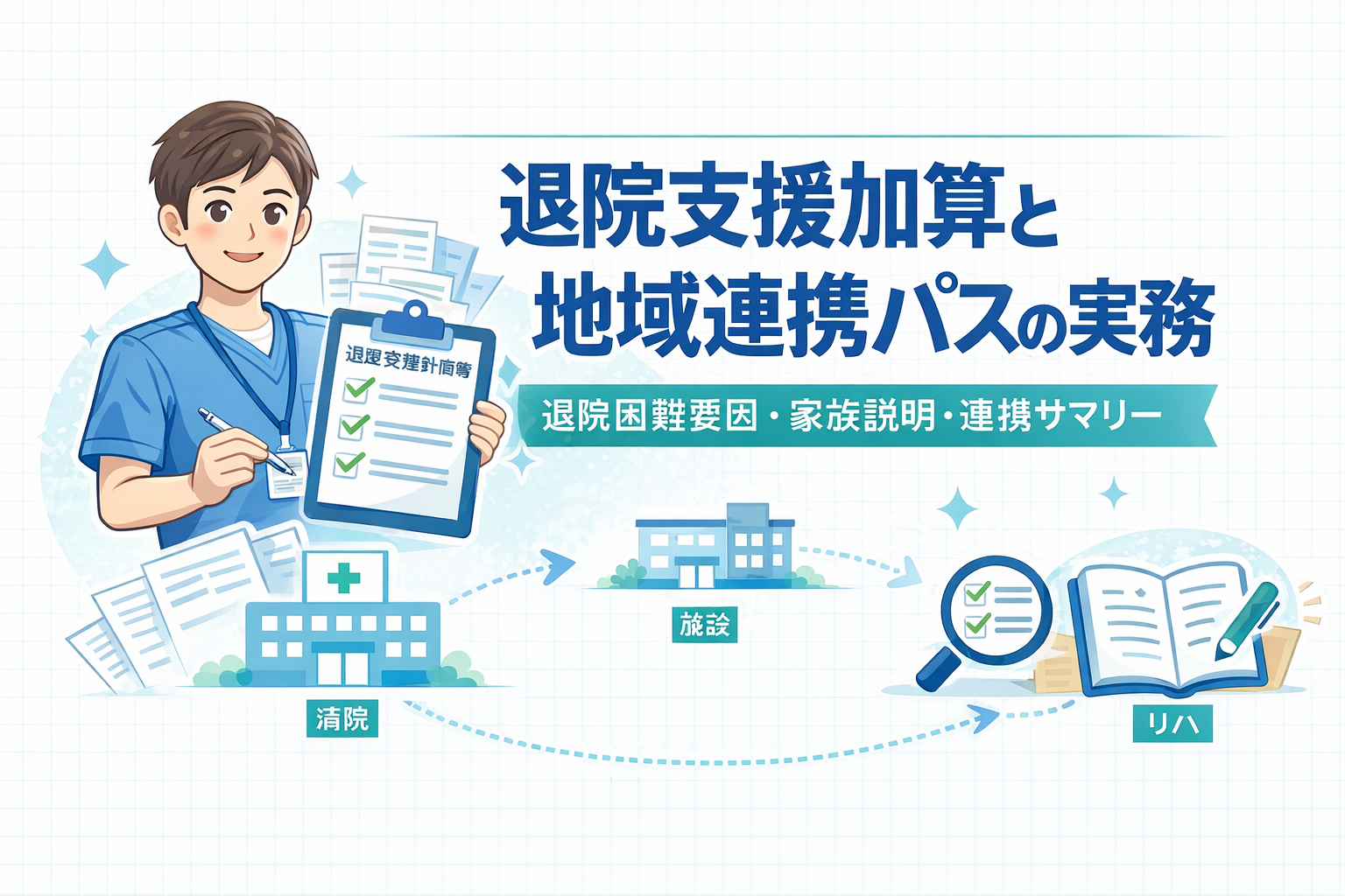 本記事では、退院支援計画を迷わず回すために、①情報整理テンプレ(何を集めるか)②家族説明テンプレ(どう伝えるか)③地域連携パス/連携サマリ(どう共有するか)の「型」を提示します。現場の詰まりどころ(よくあるズレ)もあわせて整理します。