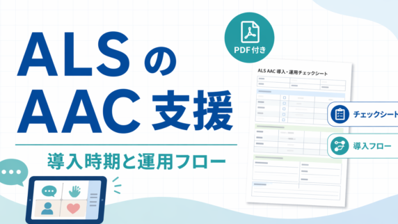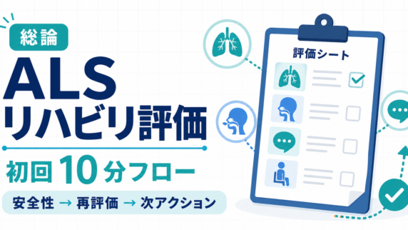 ALS のリハビリ評価を初回・定期・変化時に分け、呼吸・嚥下・AAC まで先回りして整理。A4記録シート付。