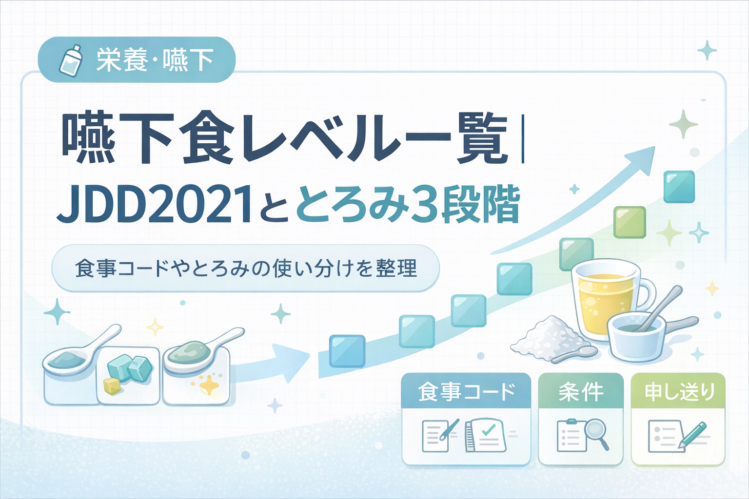 結論:嚥下食レベルで迷ったときは、 JDD2021 の食事コードととろみ 3 段階を分けて考えると整理しやすいです。この記事では、一覧を眺めて終わるのではなく、どのコードをどう選び、どう条件固定して、どう申し送るかまでを実務向けにまとめます。