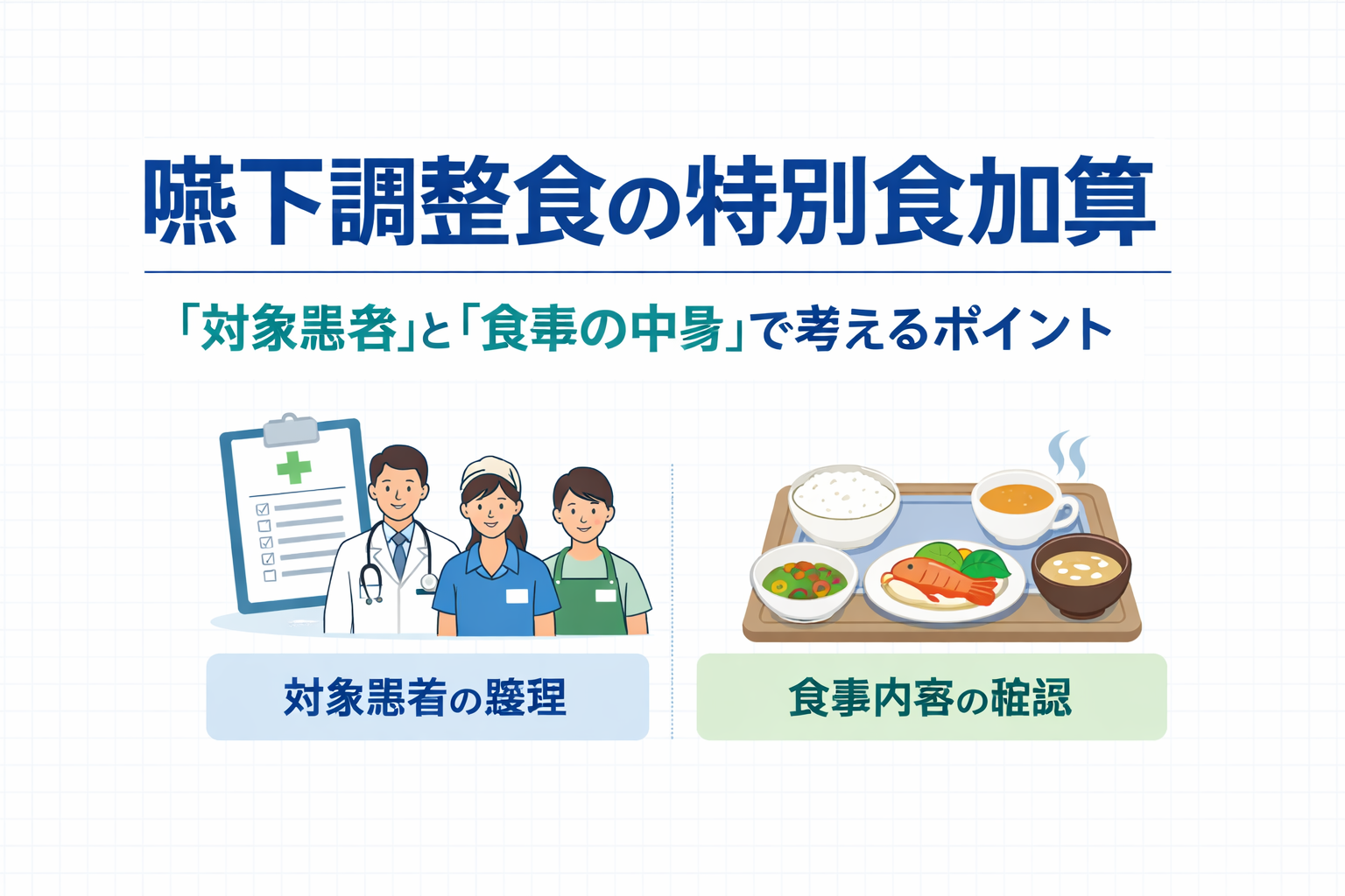 嚥下調整食の特別食加算で止まりやすいのは、「誰が対象か」と「どんな食事なら算定できるか」が混ざりやすいことです。結論からいうと、対象患者は VE / VF の有無だけで決まるのではなく、多職種評価と医師の判断、食事箋の発行で整理し、食事側は常食と同等の盛り付け・味や香り・温度・栄養量に配慮された嚥下調整食かで判断すると迷いにくくなります。