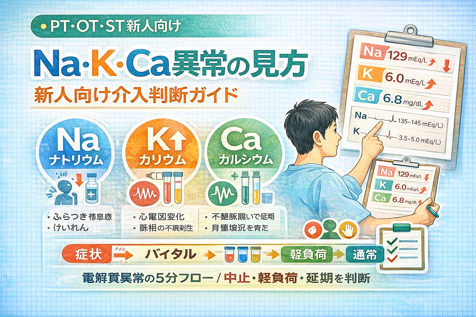Na・K・Ca の異常は、検査値そのものより「当日の介入をどう調整するか」で新人が迷いやすい領域です。PT・OT・ST の実務では、原因を断定するより、症状・バイタル・心電図所見を照合し、安全に実施可否を決めることが重要です。本記事は、現場で再現しやすい最小フローを示します。