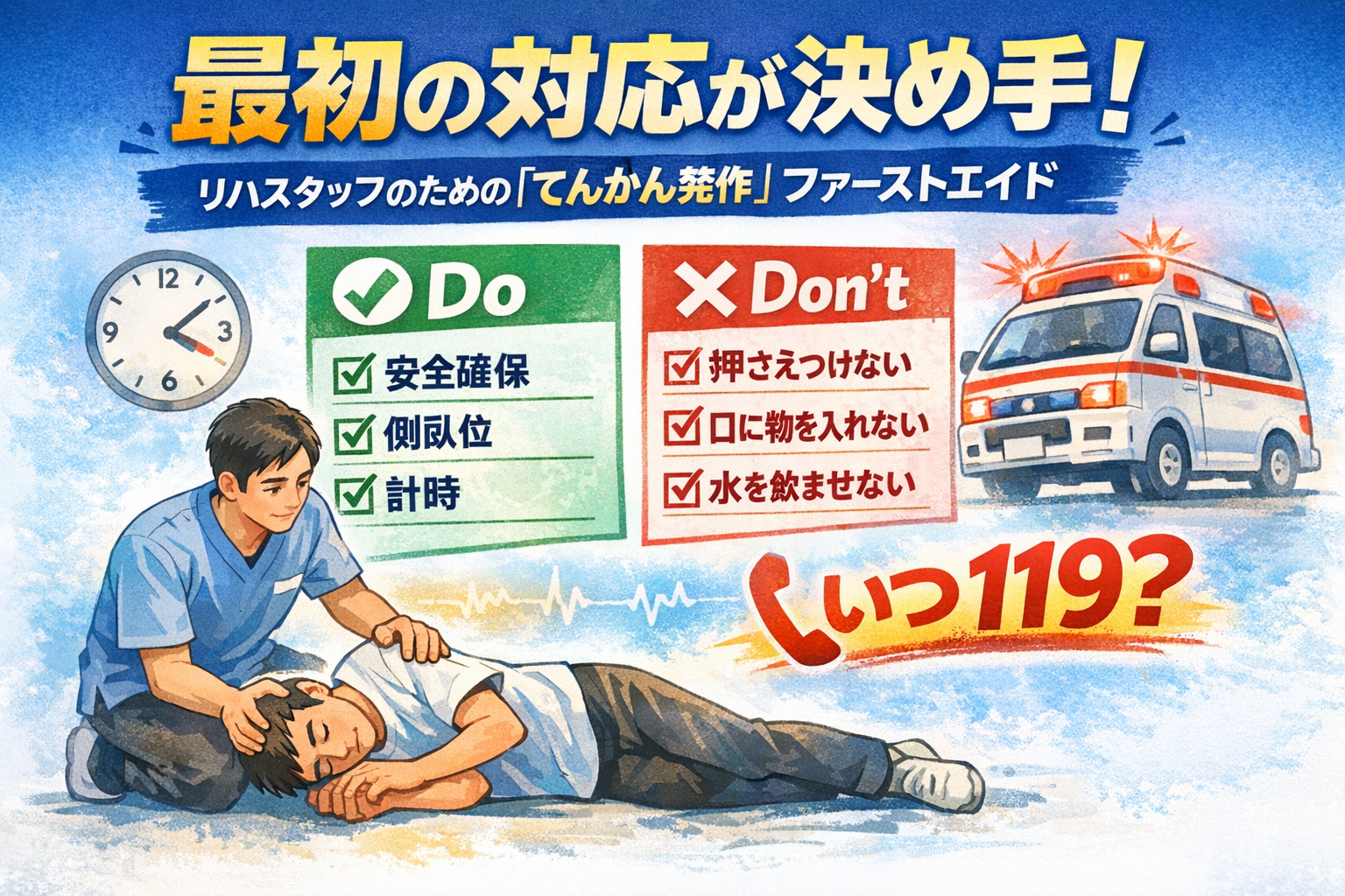 発作を目撃したとき、リハビリスタッフにまず求められるのは「危険排除・禁忌回避・計時(スタート時刻)」です。本稿は現場の PT / OT / ST 向けに、リハビリ中の一次対応の Do / Don’t 、 “いつ 119 ”の境界、そして失神・ PNES との違いを、表とチェックで整理します。