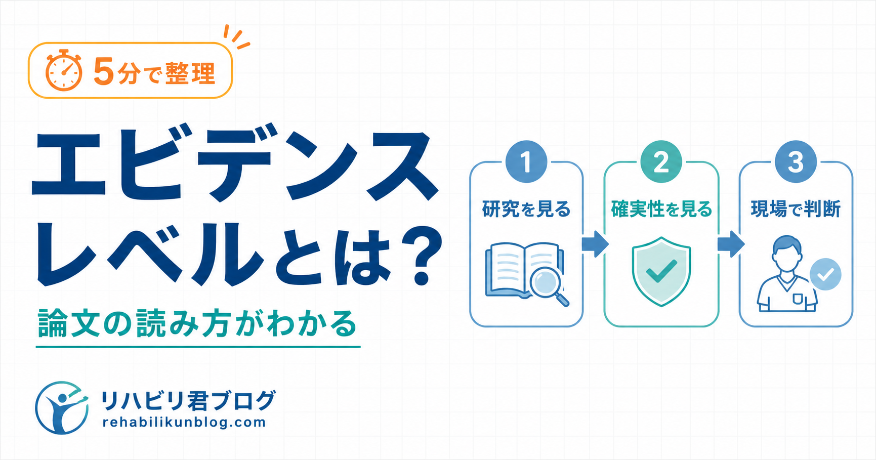 リハビリテーションでは、対象者の重症度、介入量、評価時期、施設体制の違いが結果に影響しやすくなります。エビデンスレベルを確認したうえで、臨床適用性を必ず見ます。