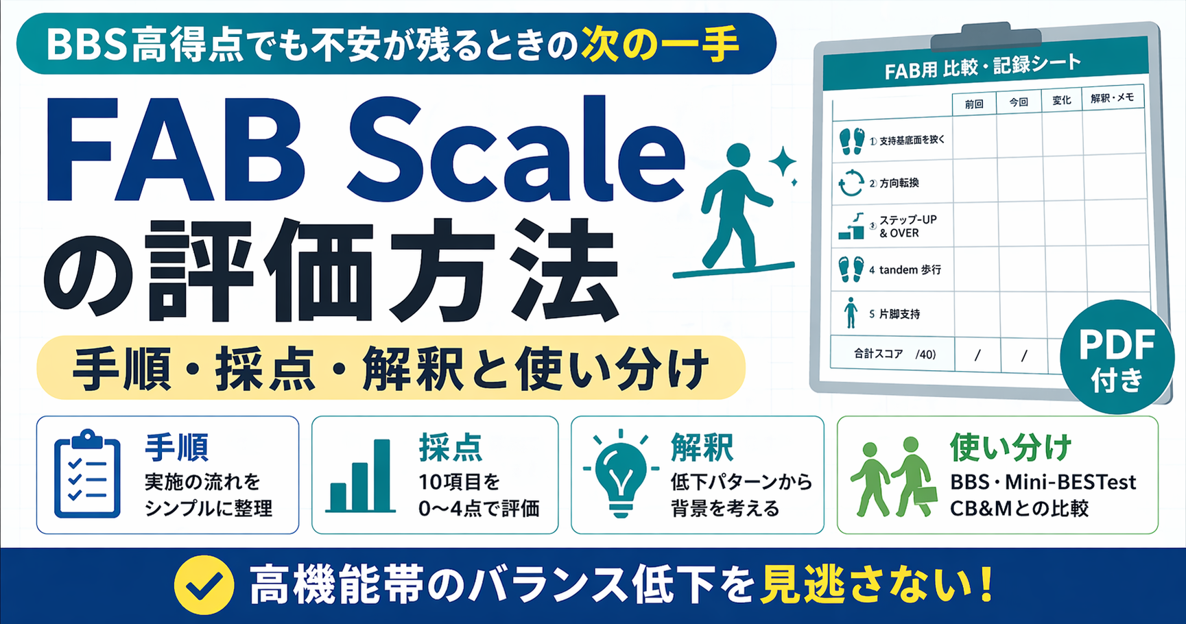 整理すると、BBS は基礎、FAB は高機能帯の中間、Mini-BESTest は要因分解、CB&M は community 高難度です。BBS だけでは足りない、でもいきなり CB&M まで行くほどではない、という場面で FAB は使いやすくなります。