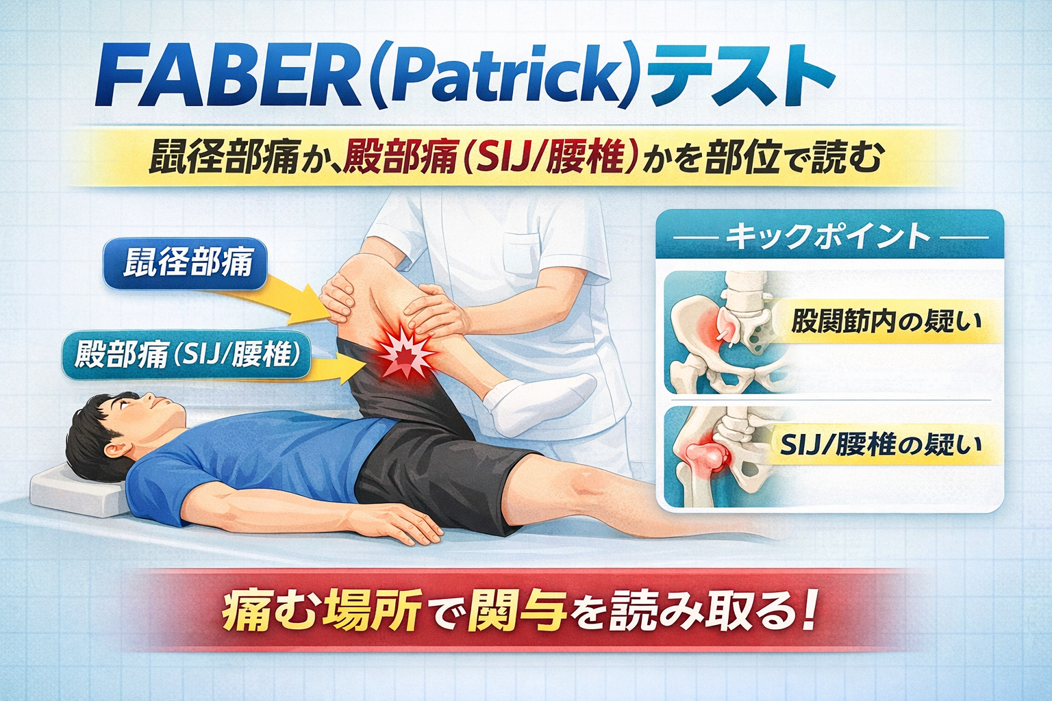 FABER( Flexion / ABduction / External Rotation )テストは、股関節周囲痛の鑑別で頻出ですが、最大のコツは「陽性かどうか」ではなく「どこが痛いか」で読むことです。鼠径部なら股関節内の関与、殿部〜仙腸関節付近なら SIJ / 腰椎由来の関与も疑い、必要なら “組み合わせ” で候補を狭めます。