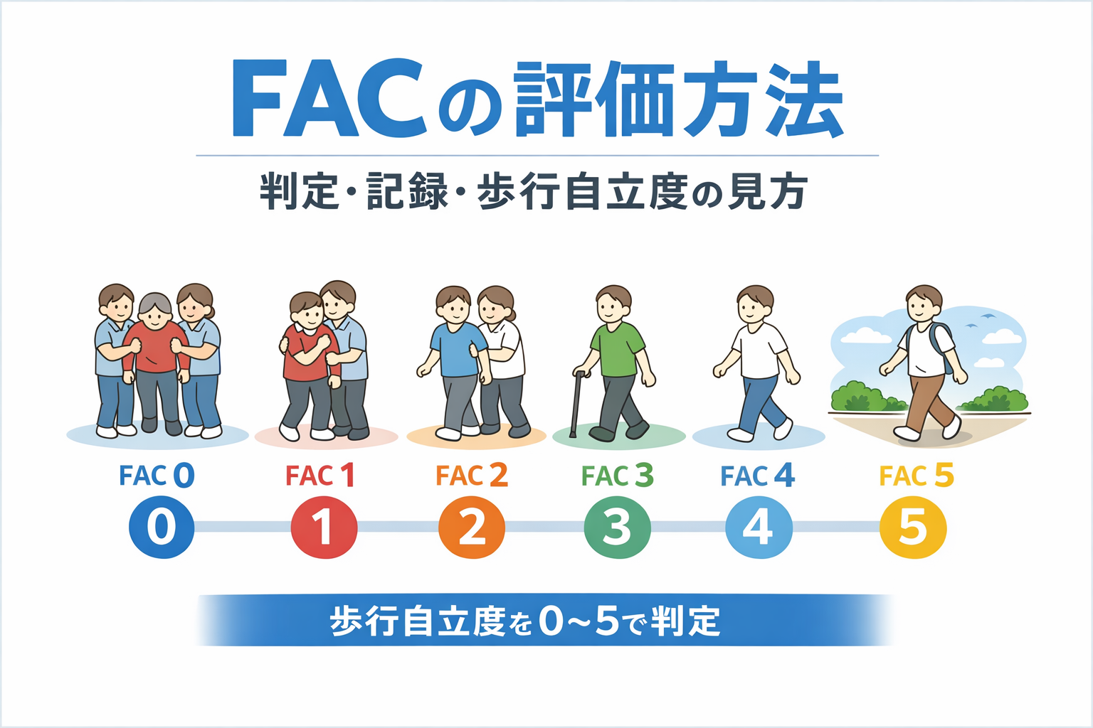 現場で便利なのは、数字がそのまま介助量の共通言語になりやすいことです。歩行・バランス評価の全体像は 歩行・バランス評価ガイド で整理できますが、本記事では FAC に絞って、判定の考え方、 0〜5 の見方、記録の型、よくある失敗、次の一手を実務目線でまとめます。