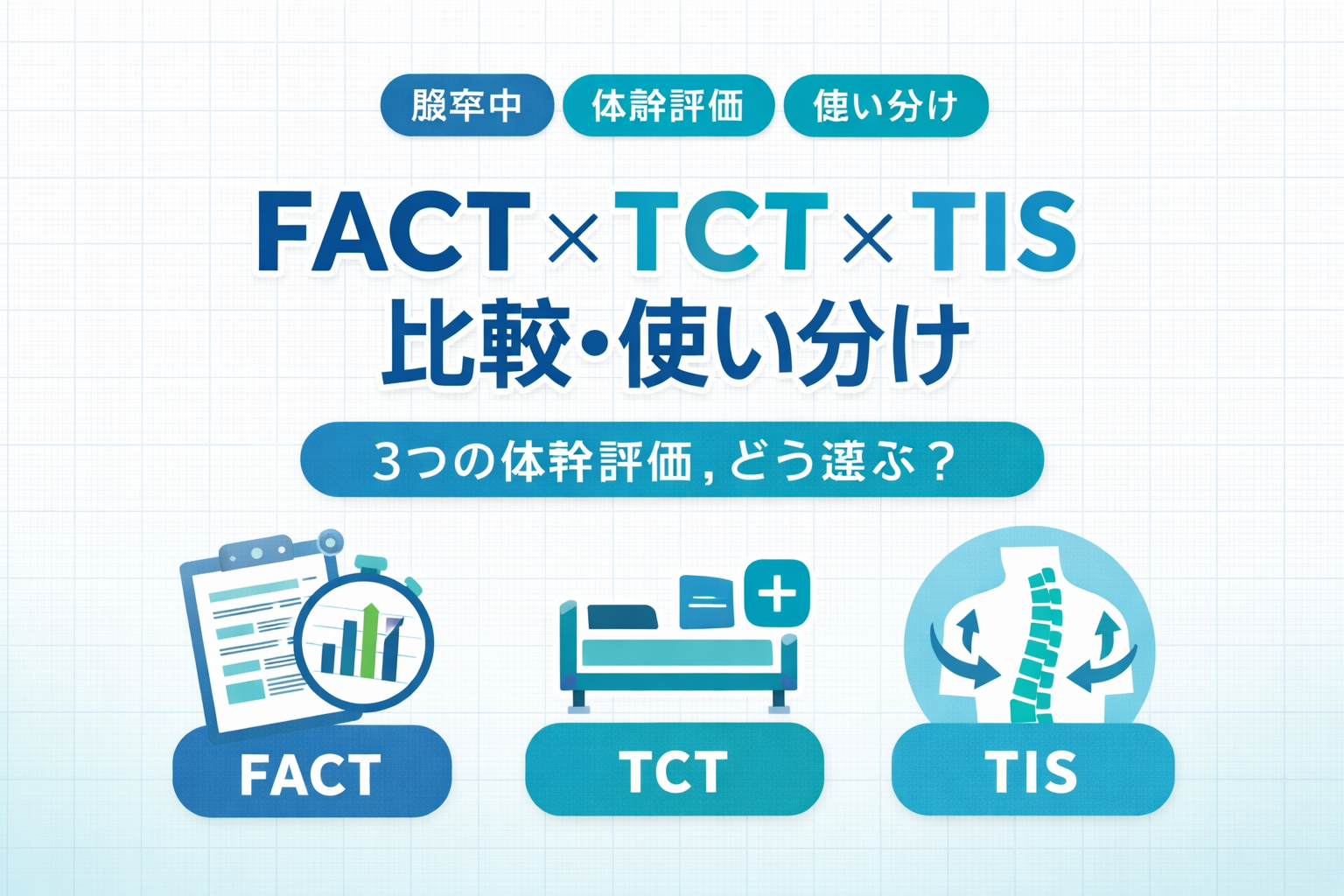 脳卒中の体幹機能評価は、同じ “ 端座位で見る ” でも、尺度によって得意分野が違います。FACT 、 TCT 、 TIS を並べると迷いやすいのは、どれも体幹を見ているようで、測っている “目的” が違うからです。