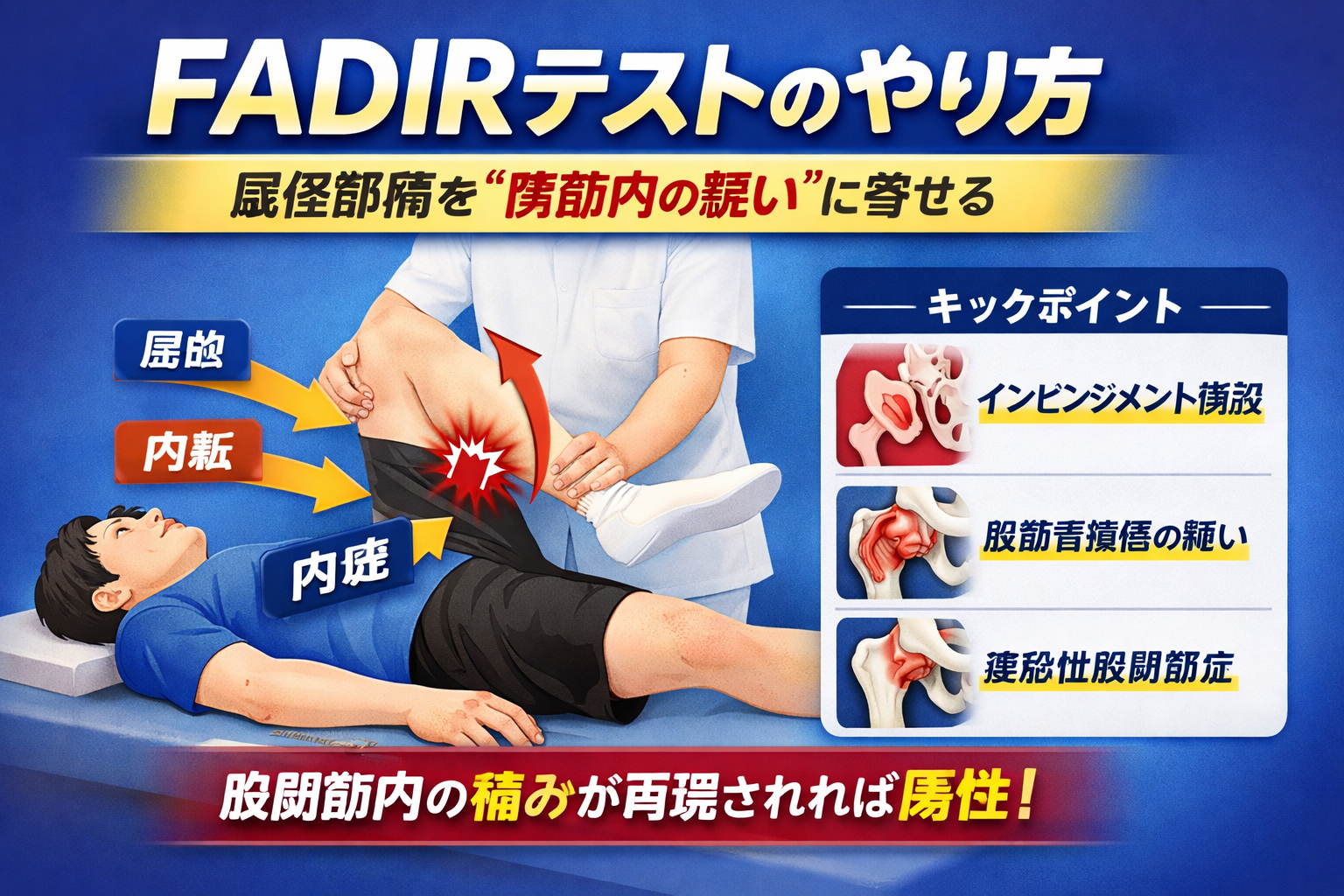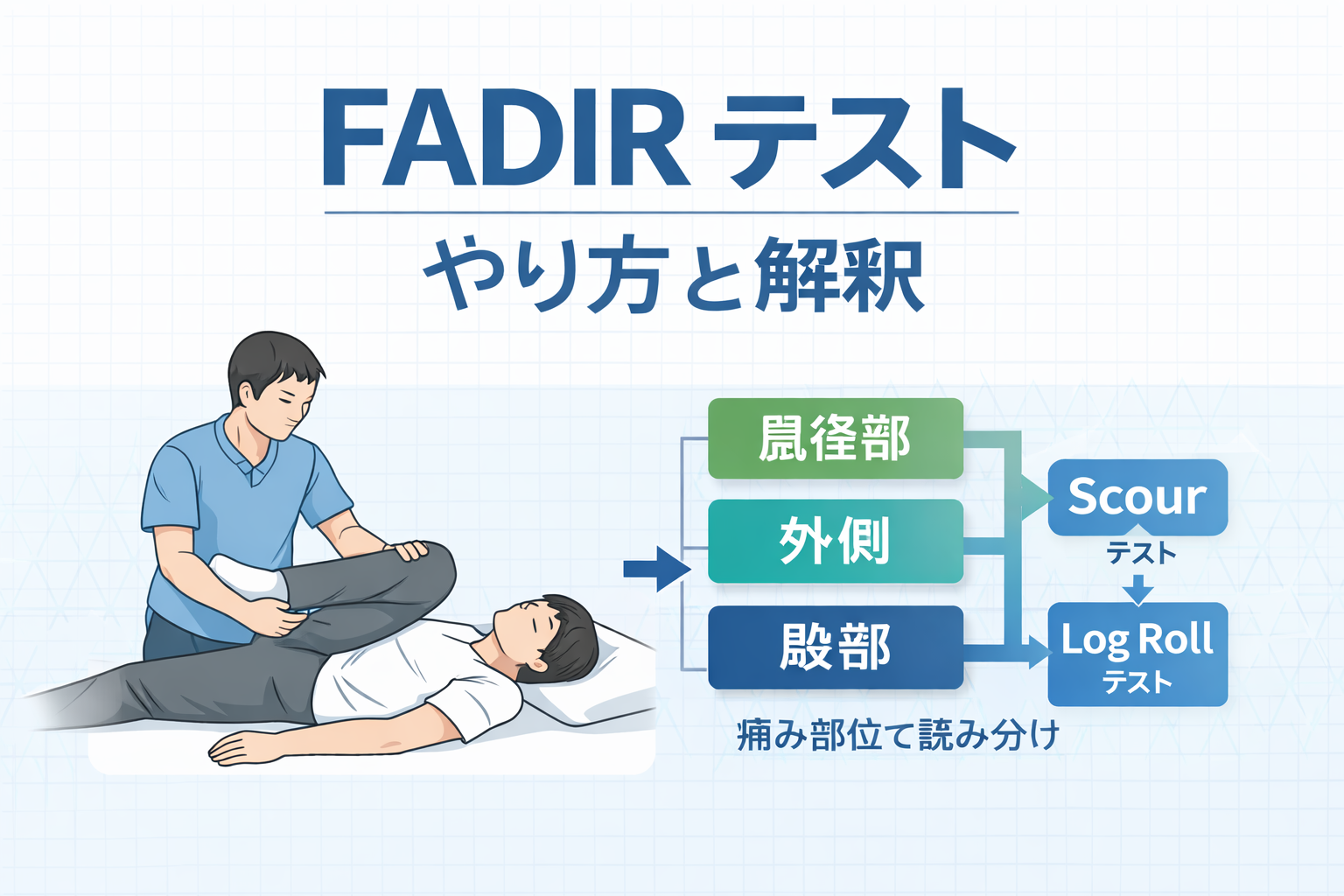 FADIR テスト( Flexion / Adduction / Internal Rotation )は、鼠径部痛や内旋制限があるときに関節内( FAI / 関節唇など)の関与を疑う入口として使われます。ポイントは「陽性 / 陰性」よりも、どこに痛みが出たか(鼠径部か、外側か、殿部か)と、可動域制限(特に内旋)をセットで残すことです。