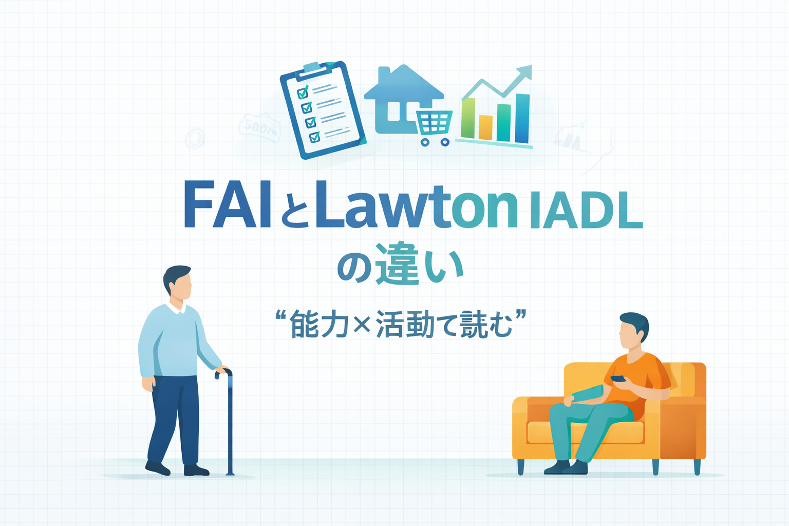 FAI( Frenchay Activities Index )と Lawton IADL( Instrumental Activities of Daily Living )は、どちらも “ IADL を見る評価 ” として語られがちです。しかし臨床では、ここを混ぜると「できるはずなのにやっていない」「やっているけど危ない」などの解釈ミスが起きます。