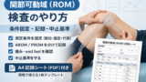 | 補助具・介助 | 常用の補助具は明記し、再評価も同条件にそろえる | 杖/歩行器、見守り/接触介助の有無 |