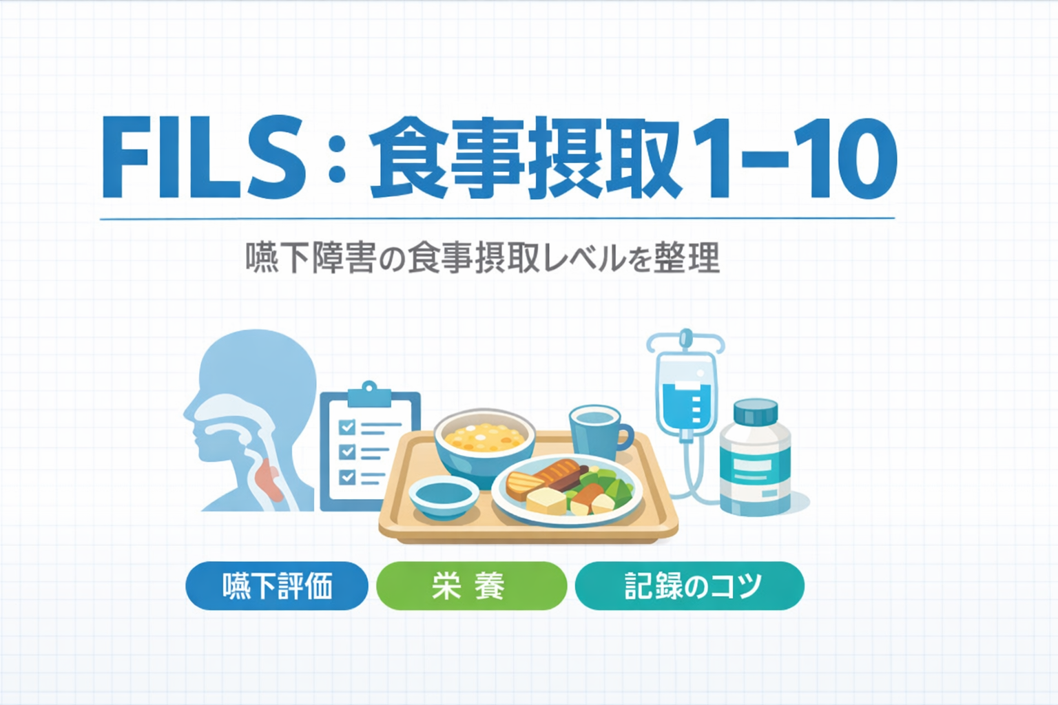 FILS( Food Intake LEVEL Scale )は、嚥下障害の「いま食べられている状態」を 10 段階で整理し、チームで共有するための観察尺度です。VE/VF がなくても運用できるため、病棟・外来・在宅でも「経過が一目で追える」形に落とし込めます。:contentReference[oaicite:1]{index=1}