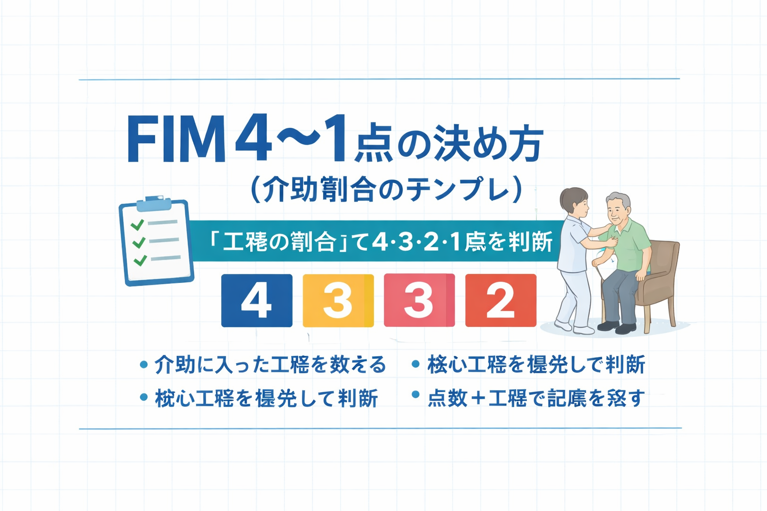 本記事では、4 点(最小介助)〜 1 点(全介助)の境界を、工程分解のテンプレとケースで整理します。FIM 全体像(点数の意味や 5 点・ 6 点との位置づけ)を先に確認したい場合は FIM の総合ガイドも併用すると、判断の順番が揃いやすくなります。