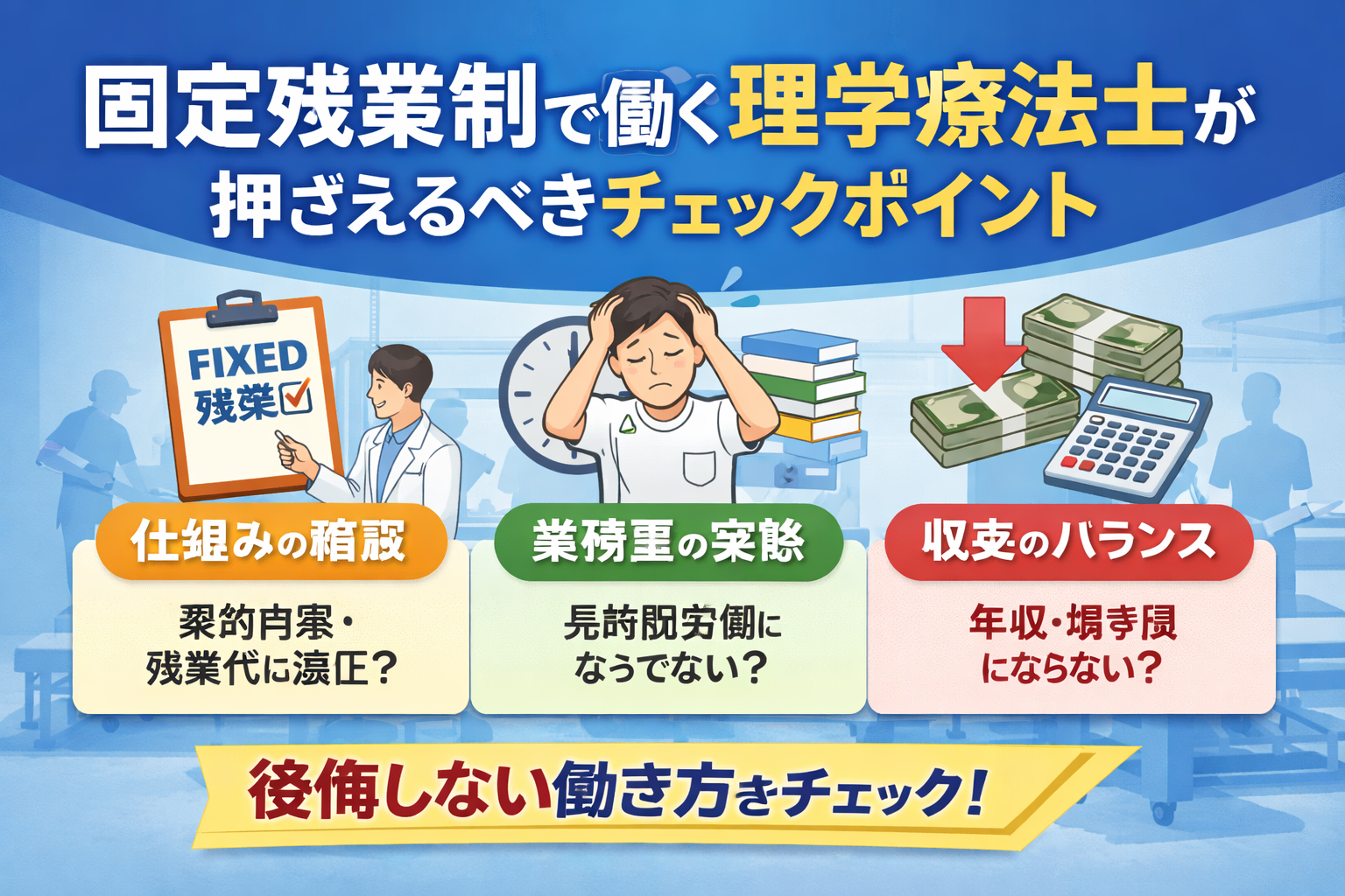 固定残業代(みなし残業代)は、一概に NG ではありません。結論として、PT 新人が最短で確認すべきは「内訳が数値で明示されているか」「超過分が追加で支払われる運用か」「見なし時間が現実的か」の 3 点です。ここが曖昧だと、総支給が高く見えても、働き方と手取りが噛み合わないリスクが上がります。
