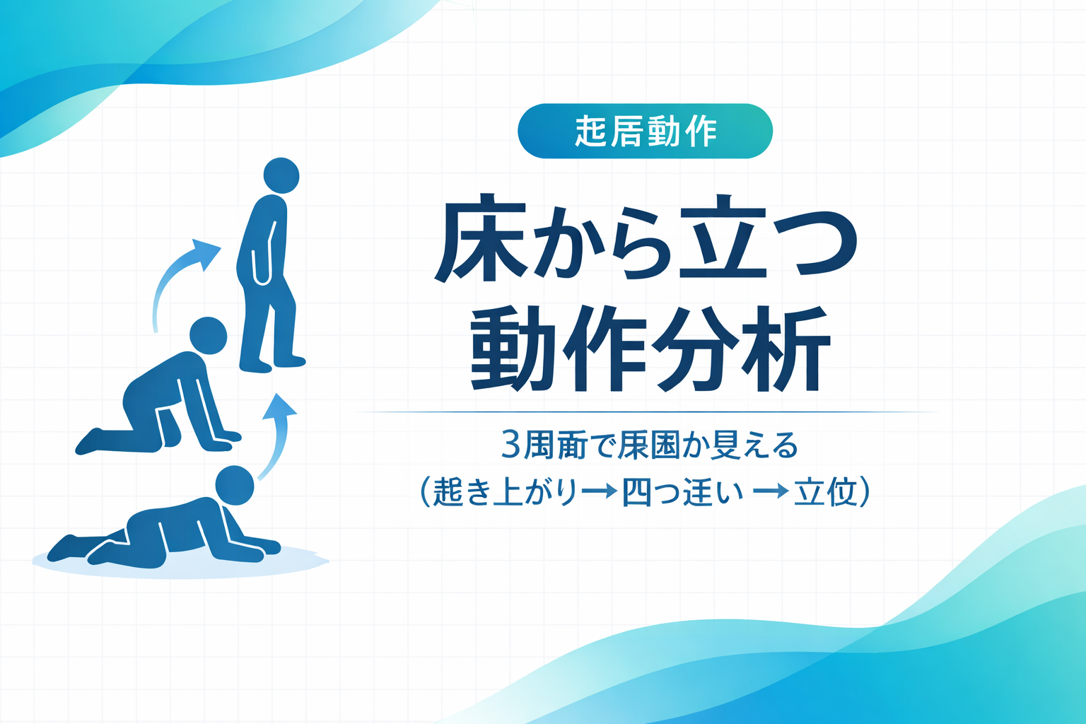本記事では、床から立つ動作を 3 局面に分けて、観察ポイント → よくある失敗 → 修正の方向性を臨床で使える形に整理します。回復期・在宅・施設で「まず何を見る?」が即決できることがゴールです。