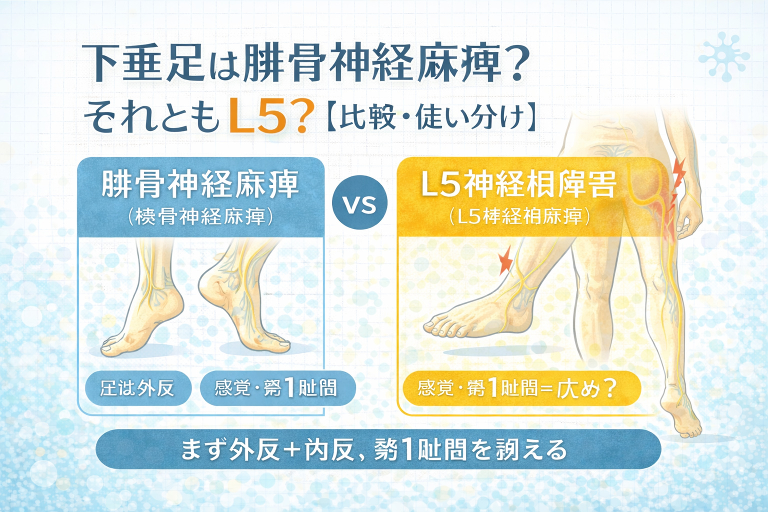 比較表:腓骨神経麻痺 vs L5 神経根障害(使い分け早見)
