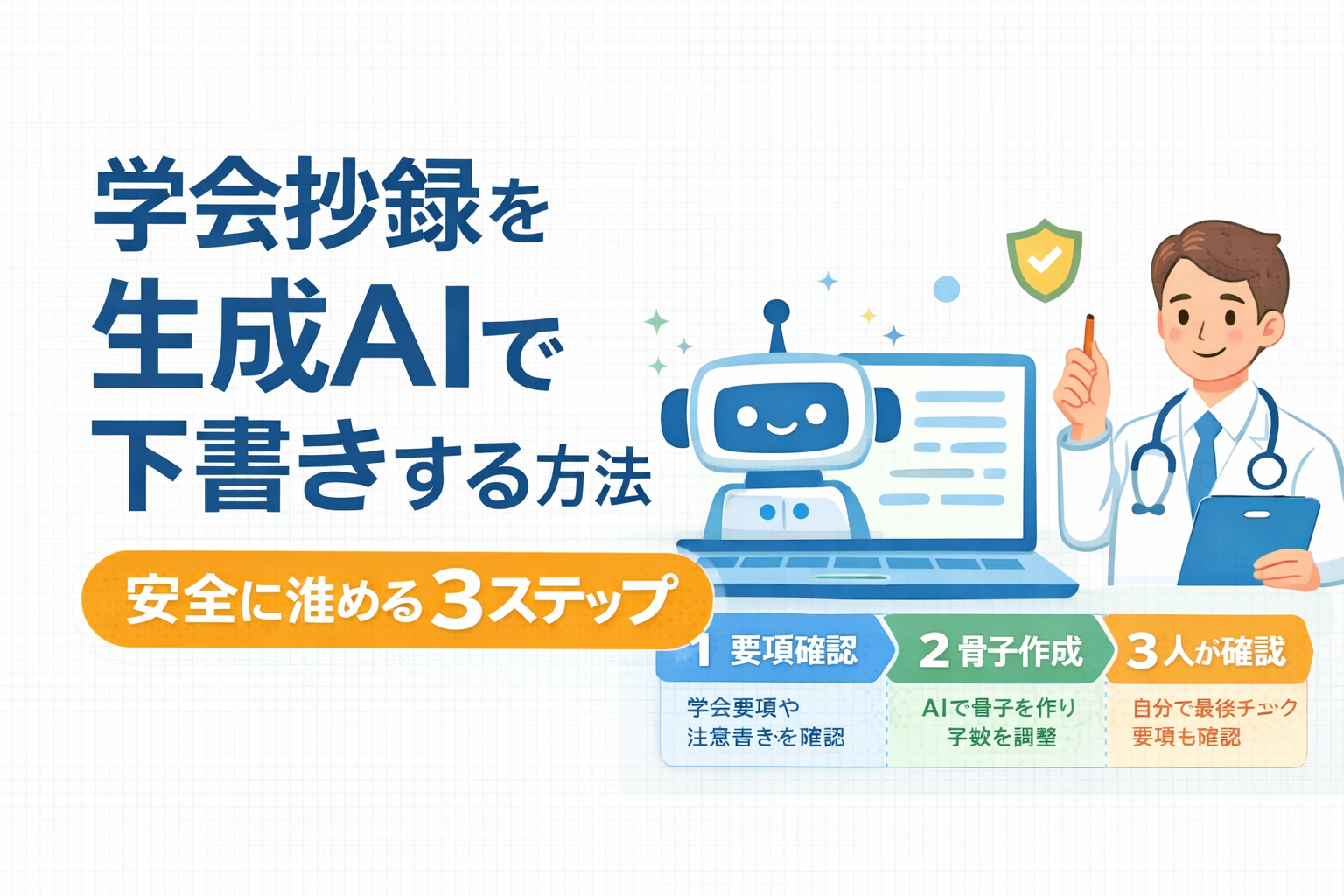 本記事では、その総論の中でも特にニーズが強い学会抄録の下書きに対象を絞ります。親記事で「安全な考え方」を押さえ、この子記事で「抄録作成の実務」に落とす構成にすると、シリーズ全体も育てやすくなります。