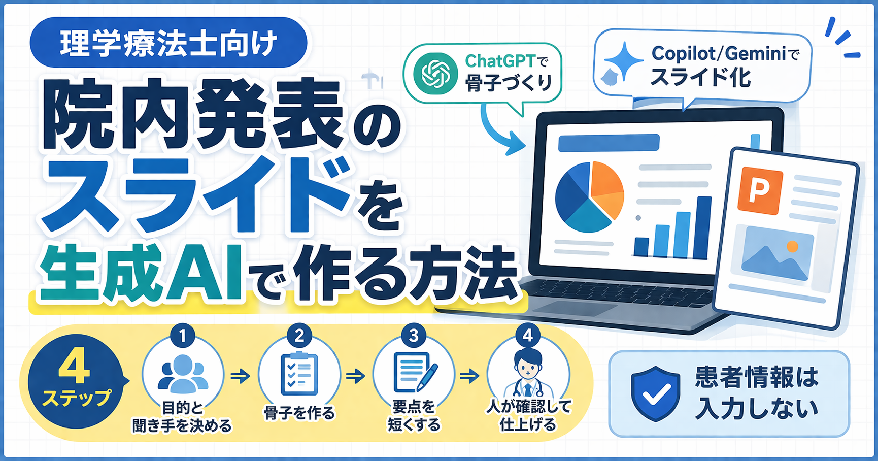 このページは、「院内発表のスライドを生成 AI でどう作るか」に絞った実践記事です。生成 AI 全体の安全な入口や、何を入力してはいけないかの全体像は、理学療法士のための生成AI活用ガイドで先に整理しています。