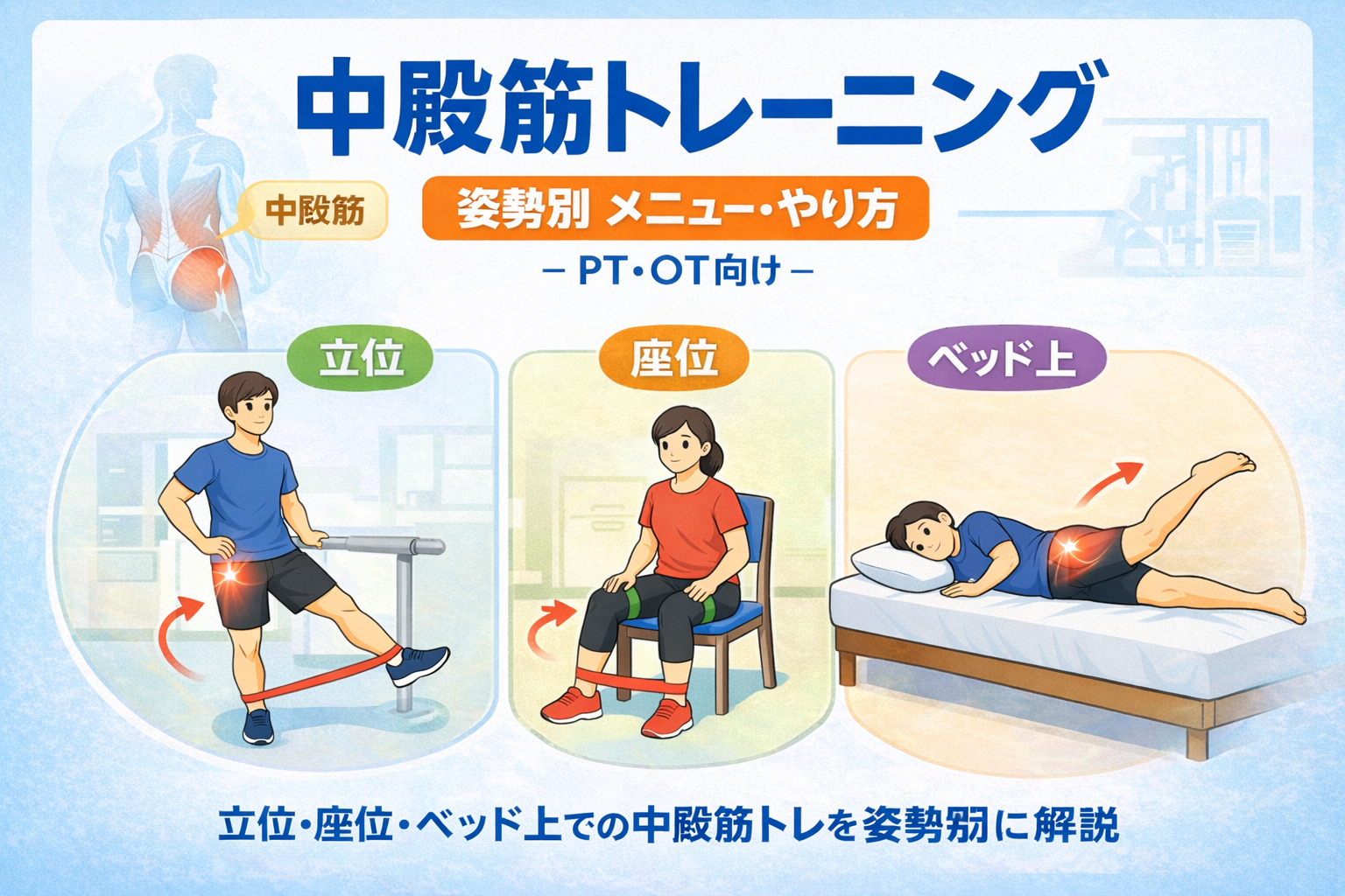 中殿筋トレーニングのやり方|立位・座位・ベッド上の姿勢別メニュー(PT/OT向け)