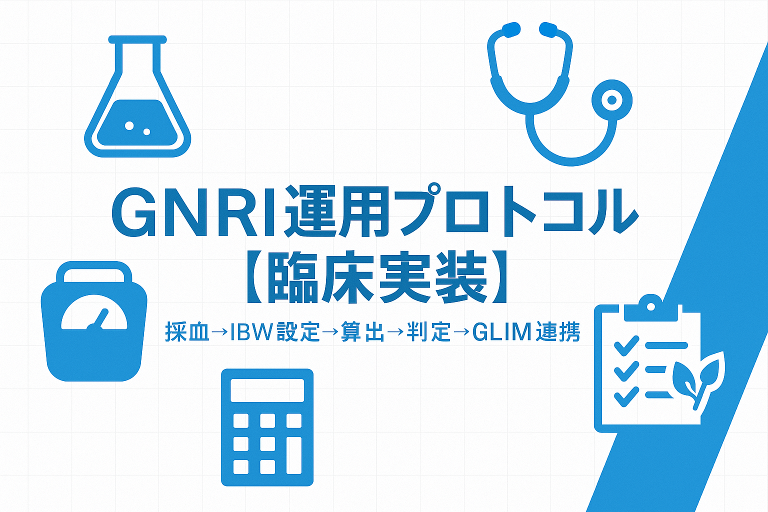 本記事は GNRI( Geriatric Nutritional Risk Index )を臨床に実装するための手順書です。採血データの取得 → IBW 設定( Lorentz / BMI 22 )→ 算出 → 判定 → GLIM 連携 → 介入・記録までを、病棟・在宅の双方で使える形に整理しました。定義や計算式の背景は既存記事(GNRI とは)をご覧ください。