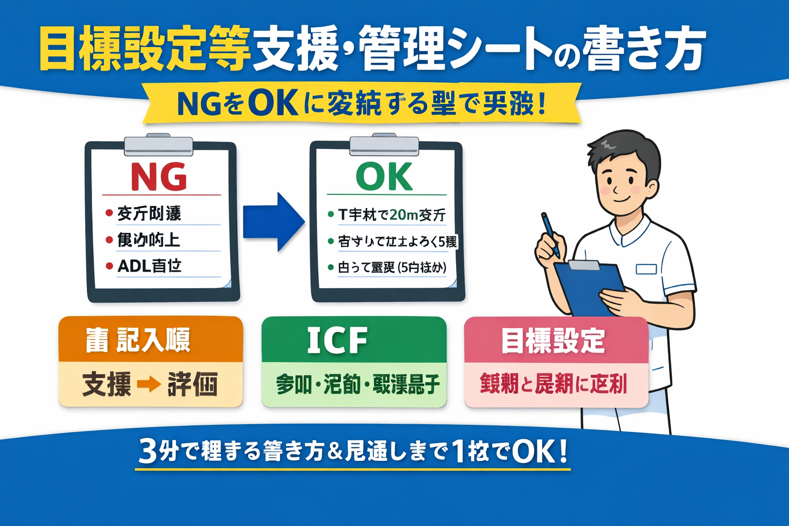 目標設定等支援・管理シート(別紙様式 23 の 5)は、思いついた順に埋めるとブレやすく、「目標が抽象的」「支援内容が薄い」「見通しが弱い」で差し戻しが起きがちです。本記事では、PT/OT/ST が 1 枚を最短で整える記入順と、よくある NG をそのまま使える OK 文へ変換する型をまとめます。