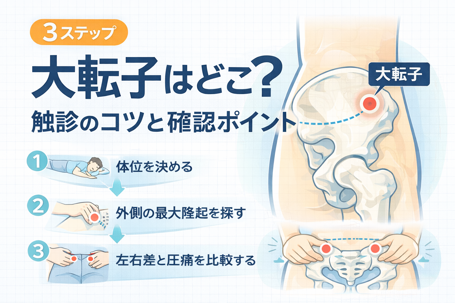順番を固定すると、大転子の触診はかなり安定します。毎回ゼロから探すのではなく、同じ流れを繰り返すのがコツです。