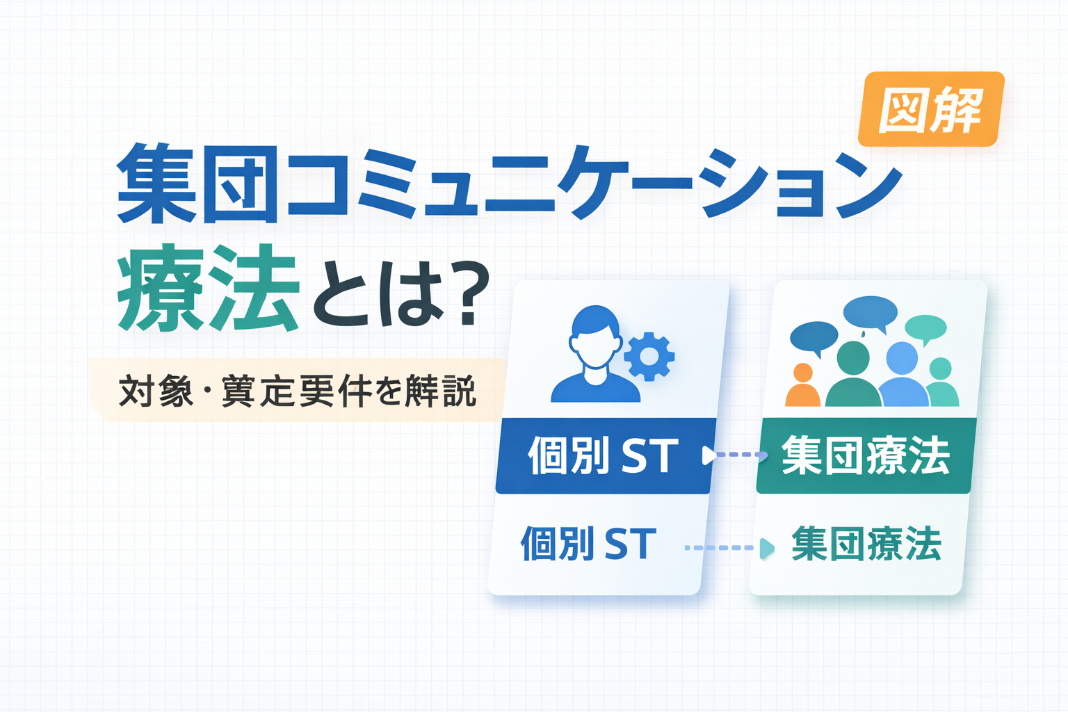 大切なのは、個別 ST と集団コミュニケーション療法を対立させないことです。実際の現場では、 個別で評価と課題設定を行い、集団で参加場面を広げる という組み合わせの方が使いやすいことが多いです。制度上の算定要件だけでなく、 どの目標をどの場面で狙うか まで分けて考えると運用が安定します。