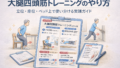 対策は「フォーム優先」「代償が増える手前で終了」「NRS 前後を毎回記録」の固定です。関連する下肢連動は 大腿四頭筋トレーニング と 大臀筋トレーニング も合わせて確認してください。