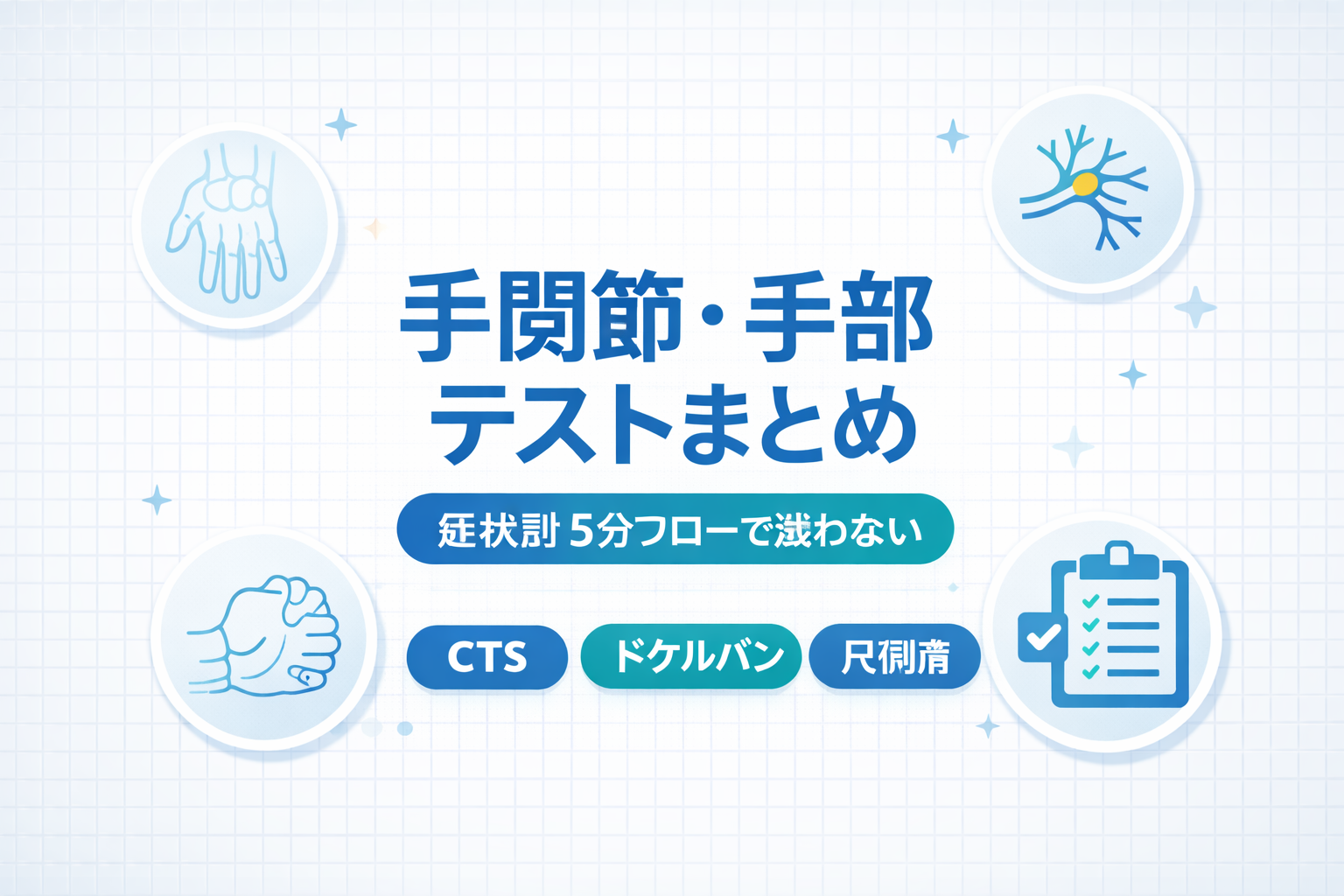 結論はシンプルで、まず①しびれ(分布)と②母指側痛(橈骨茎状突起)を最短で押さえ、必要に応じて③尺側痛( TFCC )と④舟状骨へ広げます。とくに本サイトでは、手根管( CTS )とドケルバンについては、子記事で “記録の型” まで固定しています(下の回遊リンクからすぐ行けます)。
