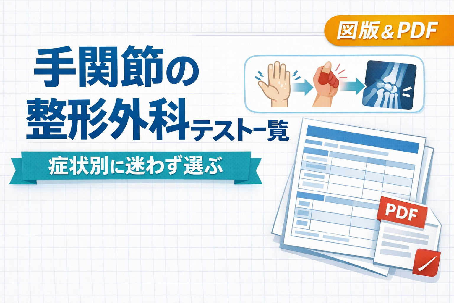 結論はシンプルで、まず①しびれの分布、②母指側痛、③尺側痛、④外傷+舟状骨周囲の 4 つに分けると、手関節・手部の整形外科テストは迷いにくくなります。この記事では、症状別の 5 分フローに加えて、全体像を一目で整理できる図版と、そのまま使える A4 記録シート PDFも用意しました。読んで終わりではなく、現場でそのまま使える形までまとめています。