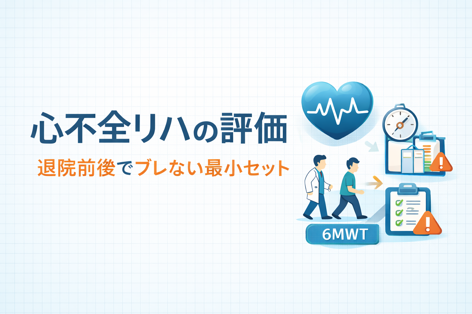 心不全リハの評価は、尺度を増やすほど運用が止まりやすいです。結論はシンプルで、退院前後で「同じ最小セット」を同条件で繰り返し、差を比べるだけで状態変化が拾いやすくなります。退院後は生活負荷が乗るため、症状と体重だけでなく、運動耐容能・下肢機能・運動強度を “同じ取り方” で取り直すことが重要です。