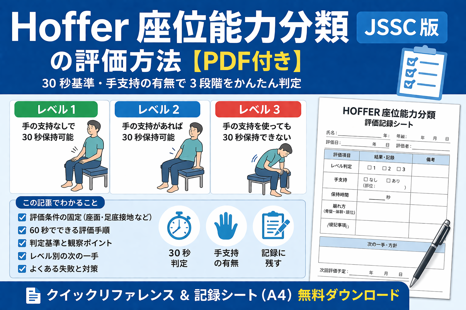 Hoffer 座位能力分類(JSSC 版)は、「この人がどこまで安全に座れるか」を 30 秒 と 手支持の有無 で 3 段階にそろえる簡易スクリーニングです。結論として、このページで押さえるべきことは 条件固定 → 30 秒判定 → 1 行記録 → 次の一手 の 4 点です。