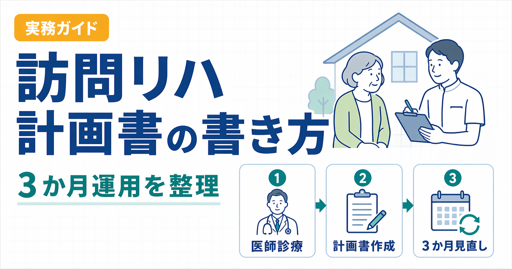 訪問リハの基本報酬では、 3 か月に 1 回以上の医師の診療と、 3 か月に 1 回以上のリハビリテーション計画の見直しが前提です。実務では、初回作成時に次回見直し予定日まで置いておくと漏れにくくなります。