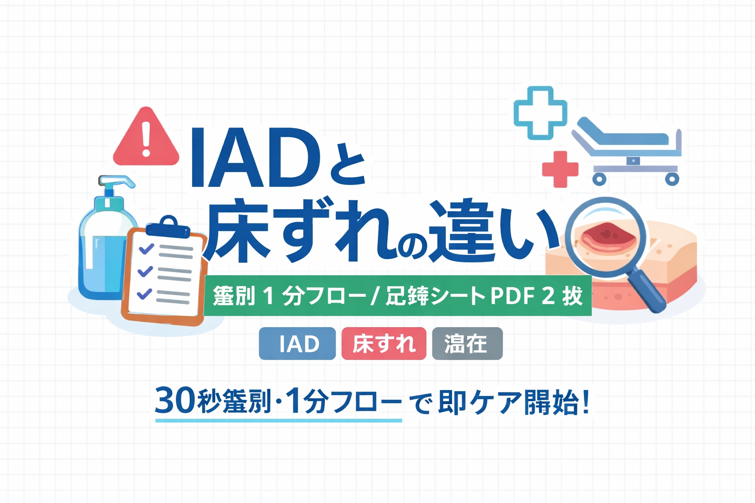 現場で一番困るのは「どっち?」ではなく、混在( IAD +褥瘡 )が普通に起こる点です。本記事は、混在を前提に仮置きで介入 → 再評価で確定できるように、早見表・ 1 分フロー・最小記録セットを 1 ページで揃えます。