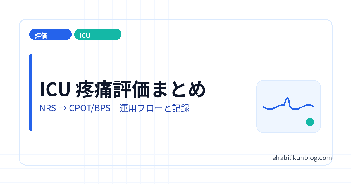 ICU では疼痛が「不穏」「拒否動作」「同調不良」に見えやすく、評価が揃わないと鎮痛・鎮静・離床の判断がブレます。結論として、自己申告できるときは NRS 、できないときは行動尺度( CPOT / BPS )に分岐し、安静→刺激→介入後の同じタイミングで回すと、チームで共通言語になります。