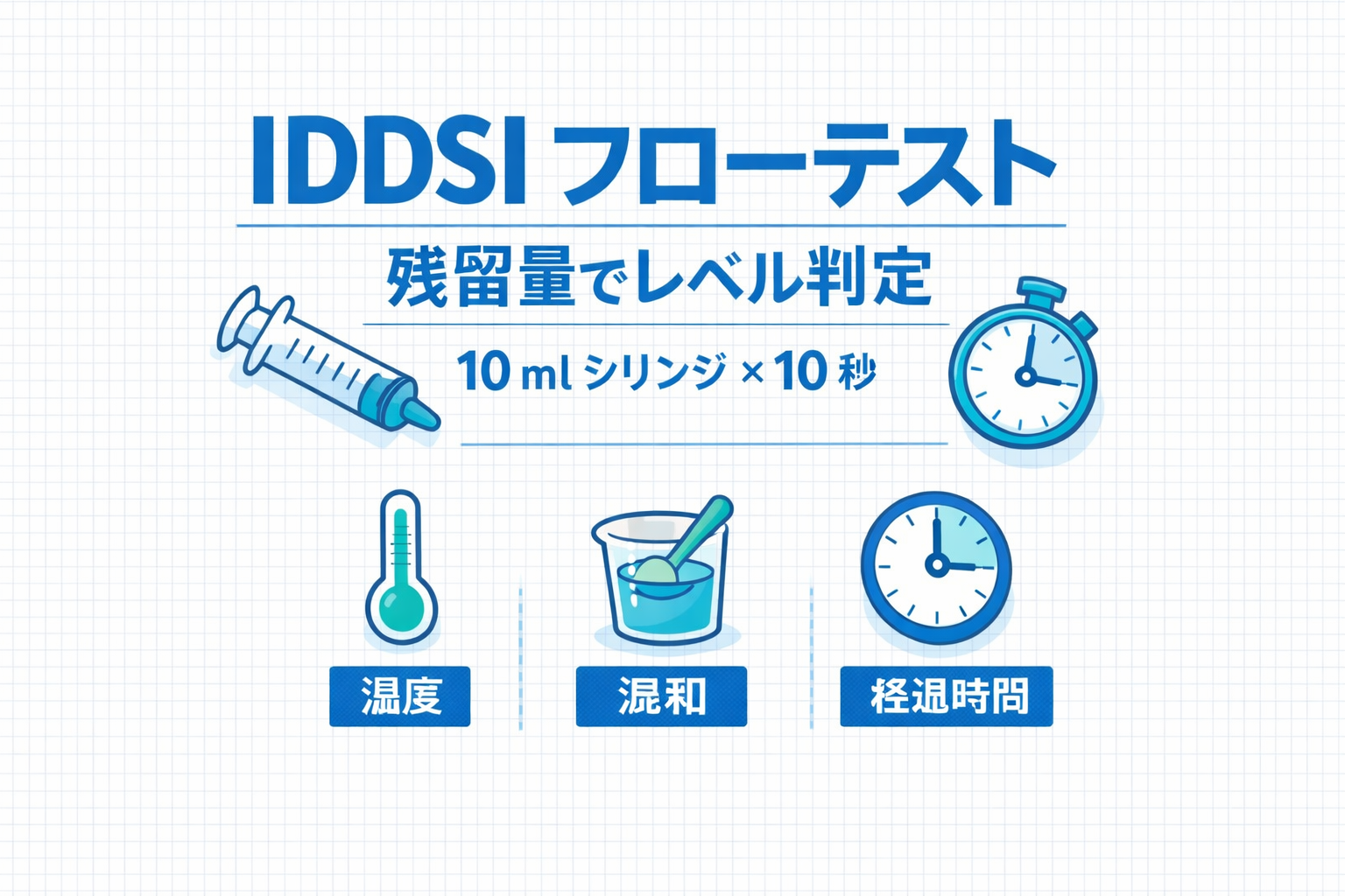 フローテストは「 10 ml を入れて 10 秒流す → 残った量で判定」というシンプルな流れです。最初に条件を固定してから測ります。