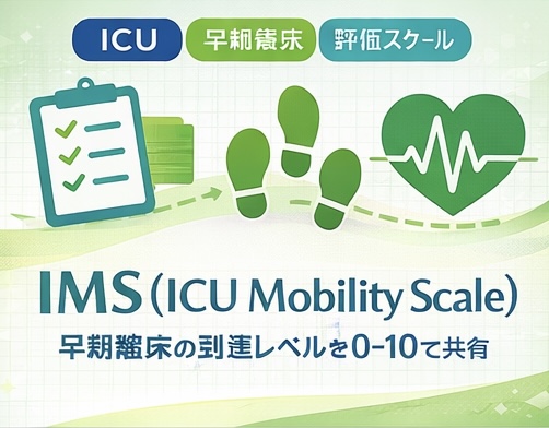IMS ( Intensive Care Unit Mobility Scale )は、重症患者(とくに ICU )の「その日の到達できた最高の離床・移動レベル」を 0–10 の順序尺度で簡潔に記録するためのツールです。多職種で「どこまで動けたか」を共通言語にできるため、早期離床の目標設定と日々の進捗共有が速くなります。