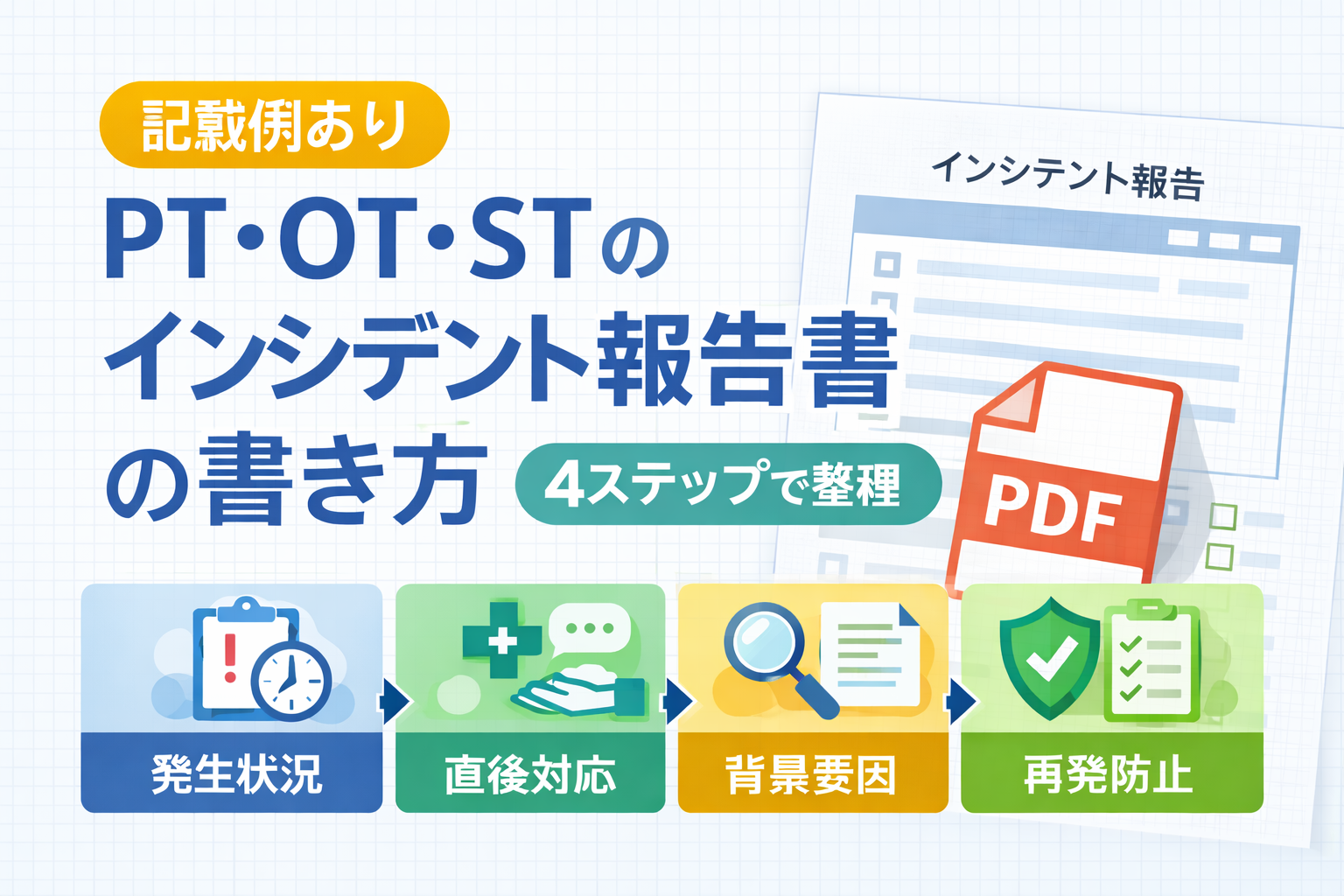 ここでは、リハ部門で起こりやすい場面を 4 つに絞って、書き方の型を示します。院内様式へそのまま写すための完成文ではなく、下書きのたたき台として使う想定です。
