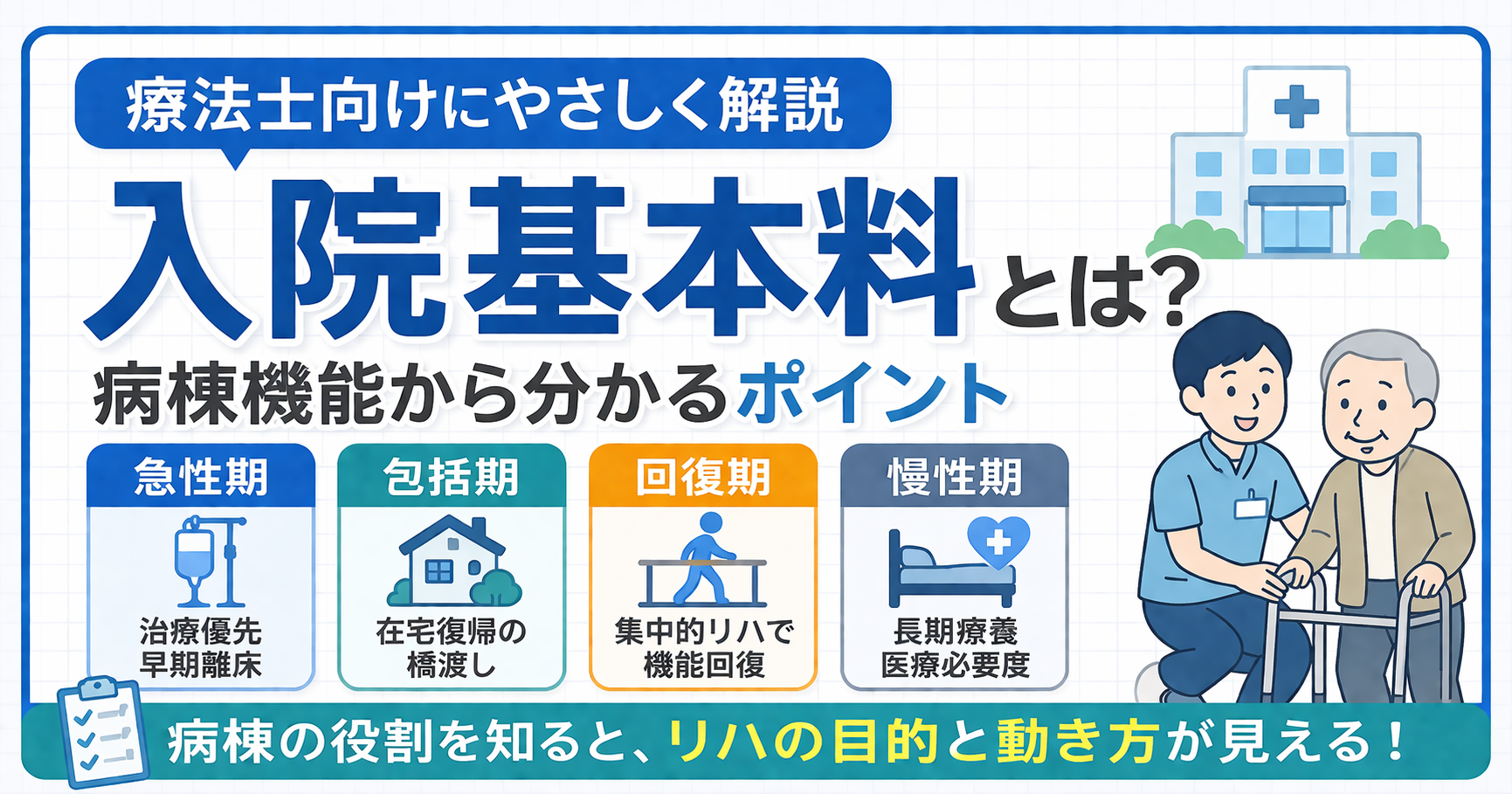 本記事では、入院基本料の全体像を療法士向けに整理し、急性期・包括期・回復期・慢性期のざっくりした違い、療法士がまず見るべきポイントをやさしくまとめます。制度の細かい加算より先に土台をつかむと、関連記事の読み分けもしやすくなります。