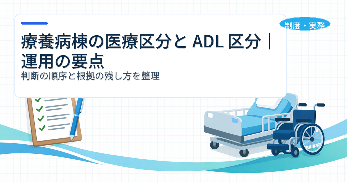 療養病棟の区分を“運用でブレない”導線:総論(本記事)→ ADL 区分の付け方 → 施設基準の全体像の順で押さえると迷いが減ります。