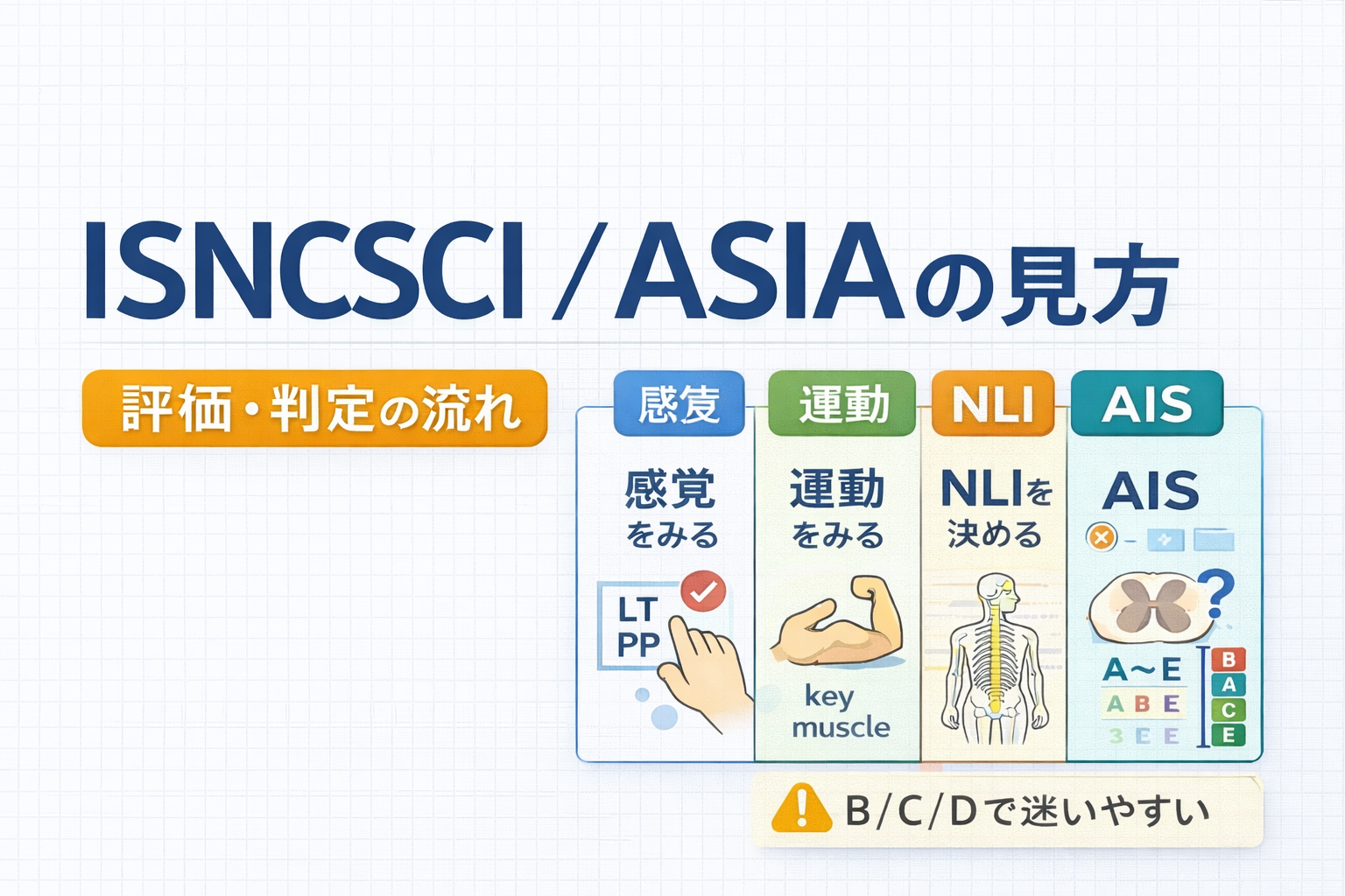 脊髄損傷の評価で「 ASIA を取っておいて」と言われても、実際には感覚、運動、 NLI 、 AIS がどうつながるのかで止まりやすいです。結論からいうと、 ISNCSCI / ASIA は脊髄損傷の神経学的レベルと重症度を共通言語でそろえるための評価です。点数を埋めること自体が目的ではなく、感覚と運動の残存を整理し、完全 / 不全や今後の共有の土台をそろえることに意味があります。
